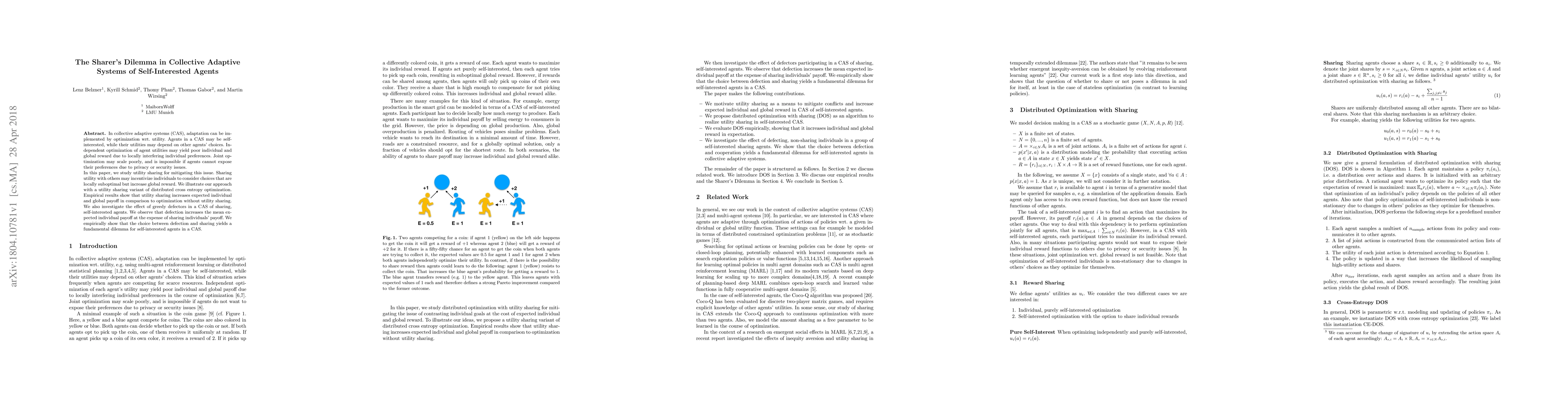 This paper explores utility sharing in collective adaptive systems (CAS) to improve individual and global rewards despite self-interested agents' conflicting preferences. It demonstrates that utility sharing can incentivize agents to make locally suboptimal but globally beneficial choices, using a distributed cross entropy optimization variant. However, it also reveals a dilemma where greedy defectors benefit individually at the expense of shared agents, highlighting the tension between self-interest and cooperation in CAS.
