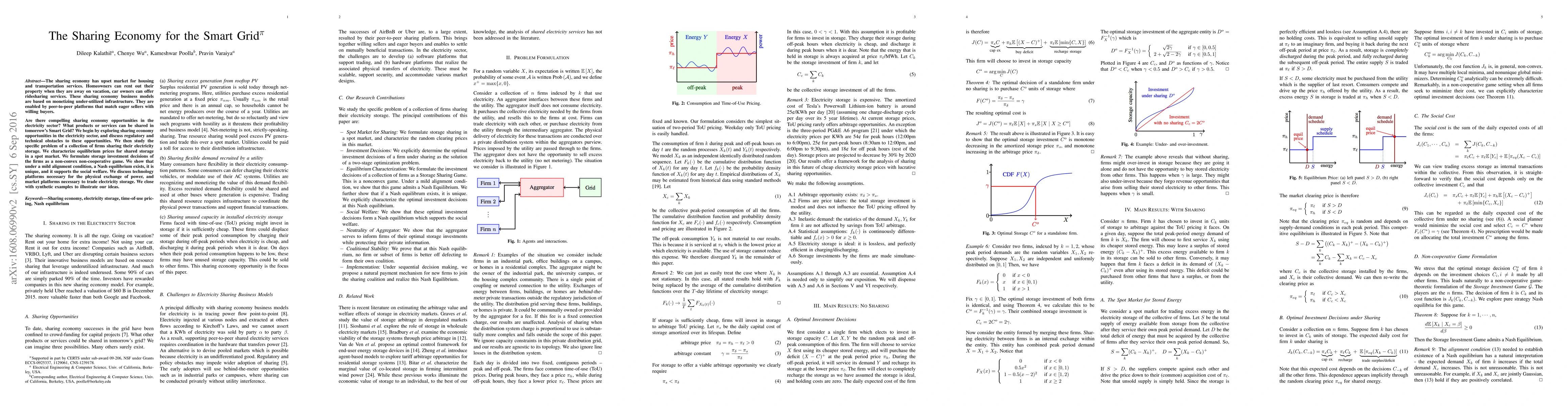 The sharing economy has disrupted housing and transportation sectors. Homeowners can rent out their property when they are away on vacation, car owners can offer ride sharing services. These sharing economy business models are based on monetizing under-utilized infrastructure. They are enabled by peer-to-peer platforms that match eager sellers with willing buyers. Are there compelling sharing economy opportunities in the electricity sector? What products or services can be shared in tomorrow's Smart Grid? We begin by exploring sharing economy opportunities in the electricity sector, and discuss regulatory and technical obstacles to these opportunities. We then study the specific problem of a collection of firms sharing their electricity storage. We characterize equilibrium prices for shared storage in a spot market. We formulate storage investment decisions of the firms as a non-convex non-cooperative game. We show that under a mild alignment condition, a Nash equilibrium exists, it is unique, and it supports the social welfare. We discuss technology platforms necessary for the physical exchange of power, and market platforms necessary to trade electricity storage. We close with synthetic examples to illustrate our ideas.