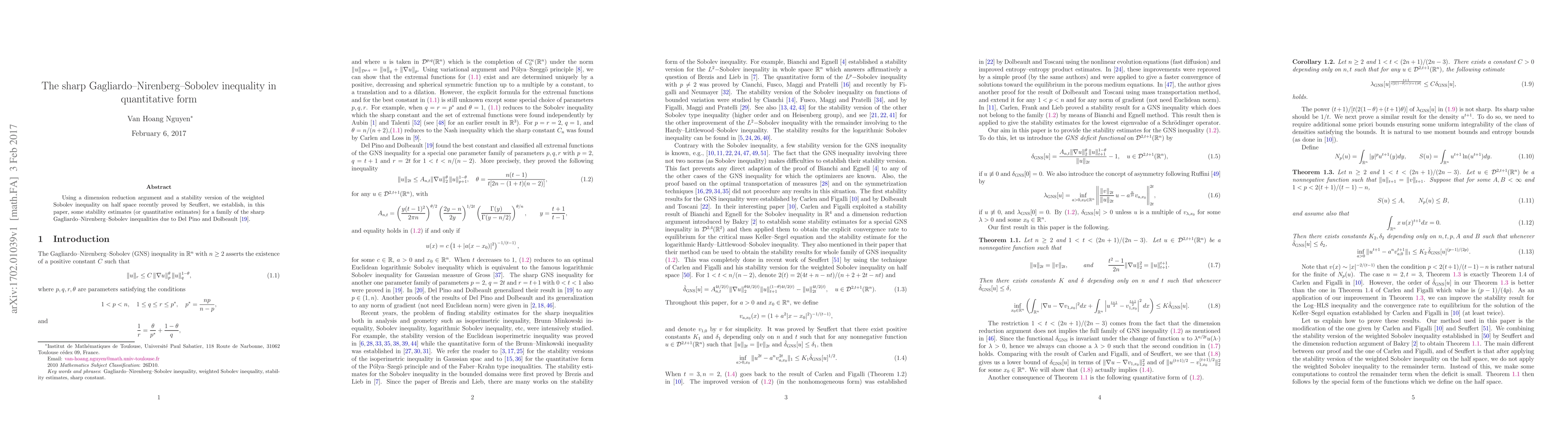 The paper establishes stability estimates for sharp Gagliardo-Nirenberg-Sobolev inequalities via a dimension reduction method and a stability version of the weighted Sobolev inequality on half space. This builds on recent results by Seuffert.