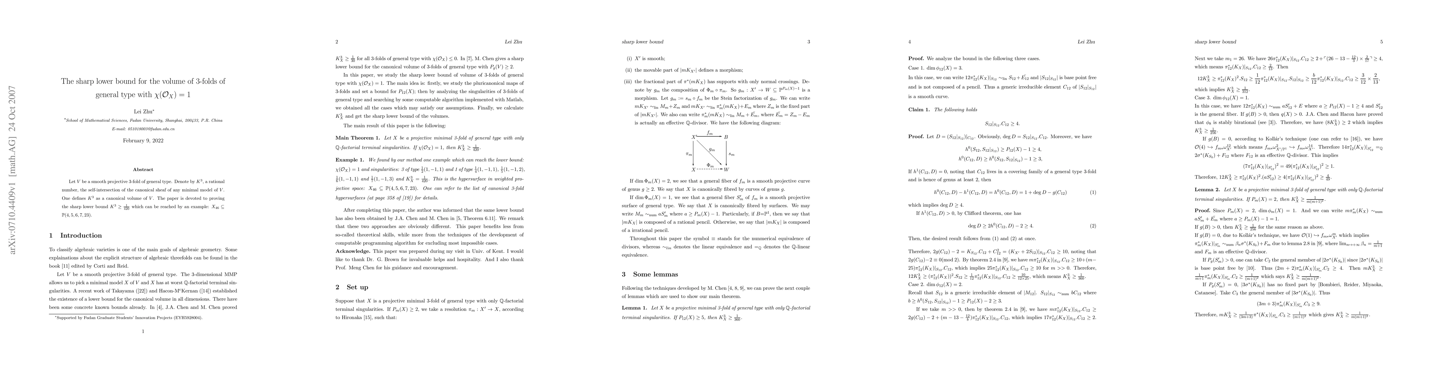 Let $V$ be a smooth projective 3-fold of general type. Denote by $K^{3}$, a rational number, the self-intersection of the canonical sheaf of any minimal model of $V$. One defines $K^{3}$ as a canonical volume of $V$. The paper is devoted to proving the sharp lower bound $K^{3}\ge {1/420}$ which can be reached by an example: $X_{46}\subseteq \mathbb{P}(4,5,6,7,23)$.