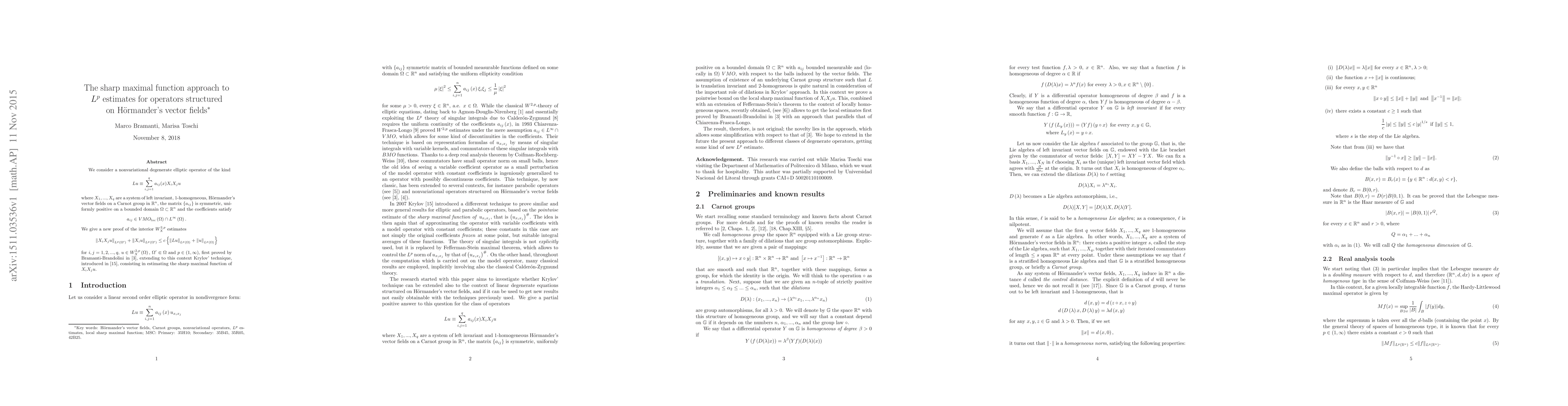 We consider a nonvariational degenerate elliptic operator structured on a system of left invariant, 1-homogeneous, H\"ormander's vector fields on a Carnot group in $R^{n}$, where the matrix of coefficients is symmetric, uniformly positive on a bounded domain of $R^{n}$ and the coefficients are bounded, measurable and locally VMO in the domain. We give a new proof of the interior $L^{p}$ estimates on the second order derivatives with respect to the vector fields, first proved by Bramanti-Brandolini in [Rend. Sem. Mat. dell'Univ. e del Politec. di Torino, Vol. 58, 4 (2000), 389-433], extending to this context Krylov' technique, introduced in [Comm. in P.D.E.s, 32 (2007), 453-475], consisting in estimating the sharp maximal function of the second order derivatives.