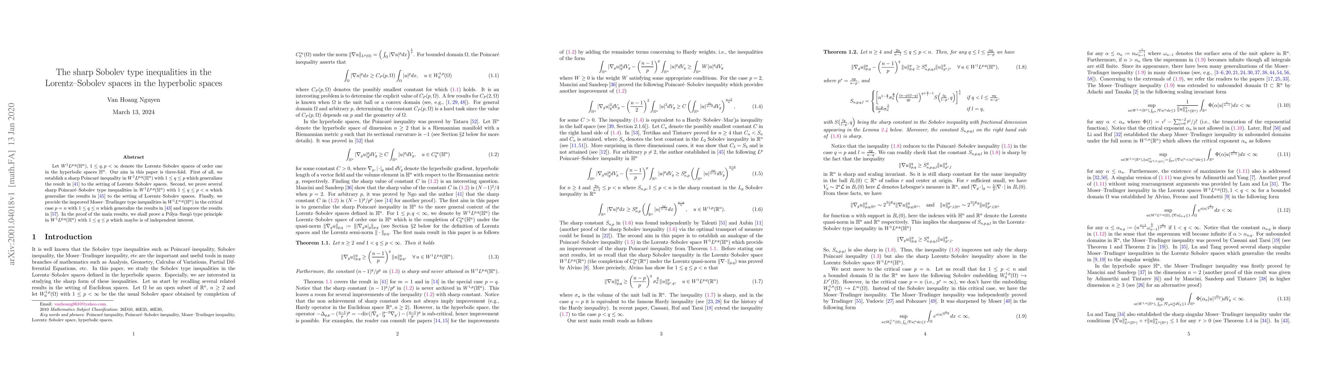 Let $W^1L^{p,q}(\mathbb H^n)$, $1\leq q,p < \infty$ denote the Lorentz-Sobolev spaces of order one in the hyperbolic spaces $\mathbb H^n$. Our aim in this paper is three-fold. First of all, we establish a sharp Poincar\'e inequality in $W^1L^{p,q}(\mathbb H^n)$ with $1\leq q \leq p$ which generalizes the result in \cite{NgoNguyenAMV} to the setting of Lorentz-Sobolev spaces. Second, we prove several sharp Poincar\'e-Sobolev type inequalities in $W^1L^{p,q}(\mathbb H^n)$ with $1\leq q \leq p < n$ which generalize the results in \cite{NguyenPS2018} to the setting of Lorentz-Sobolev spaces. Finally, we provide the improved Moser-Trudinger type inequalities in $W^1L^{n,q}(\mathbb{H}^n)$ in the critical case $p= n$ with $1\leq q \leq n$ which generalize the results in \cite{NguyenMT2018} and improve the results in \cite{YangLi2019}. In the proof of the main results, we shall prove a P\'olya--Szeg\"o type principle in $W^1 L^{p,q}(\mathbb H^n)$ with $1\leq q \leq p$ which maybe is of independent interest.
