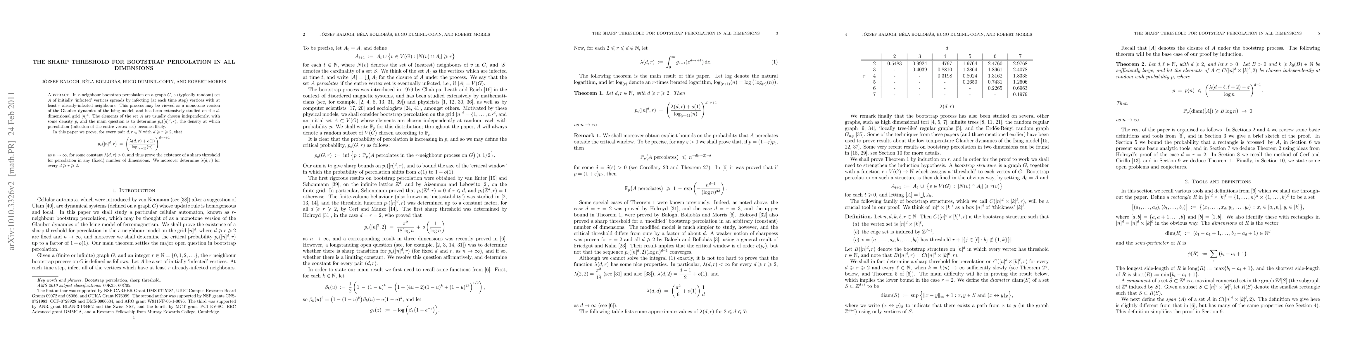 This paper establishes a sharp threshold for bootstrap percolation in all dimensions, proving that for any fixed dimensions $d \ge r \ge 2$, there exists a constant $L(d,r)$ such that the percolation density $p_c([n]^d,r)$ scales as $[(L(d,r) + o(1)) / log_{r-1}(n)]^{d-r+1}$ as $n$ approaches infinity.