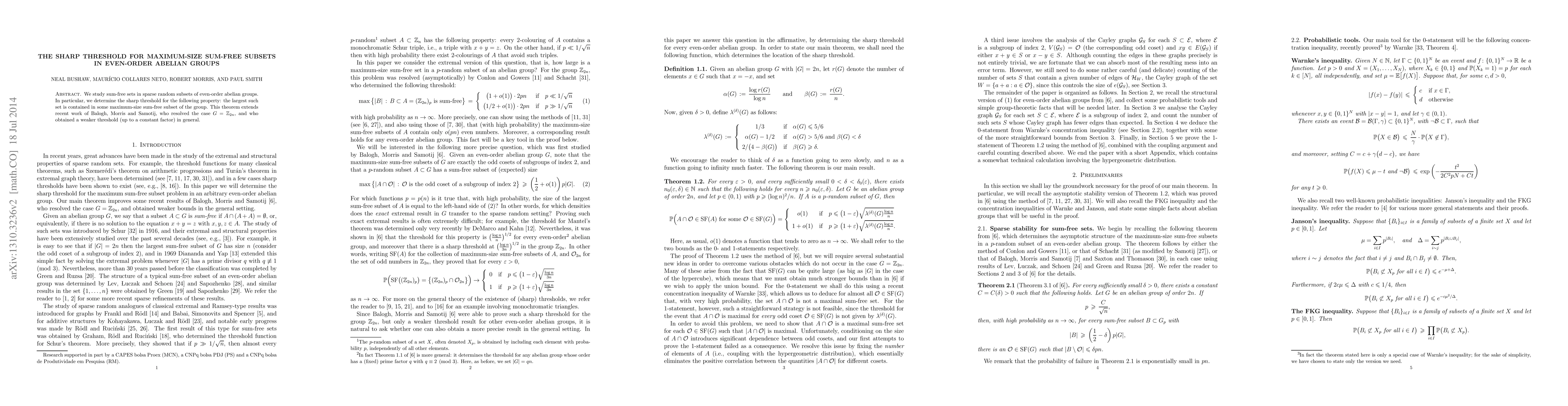 We study sum-free sets in sparse random subsets of even order abelian groups. In particular, we determine the sharp threshold for the following property: the largest such set is contained in some maximum-size sum-free subset of the group. This theorem extends recent work of Balogh, Morris and Samotij, who resolved the case G = Z_{2n}, and who obtained a weaker threshold (up to a constant factor) in general.
