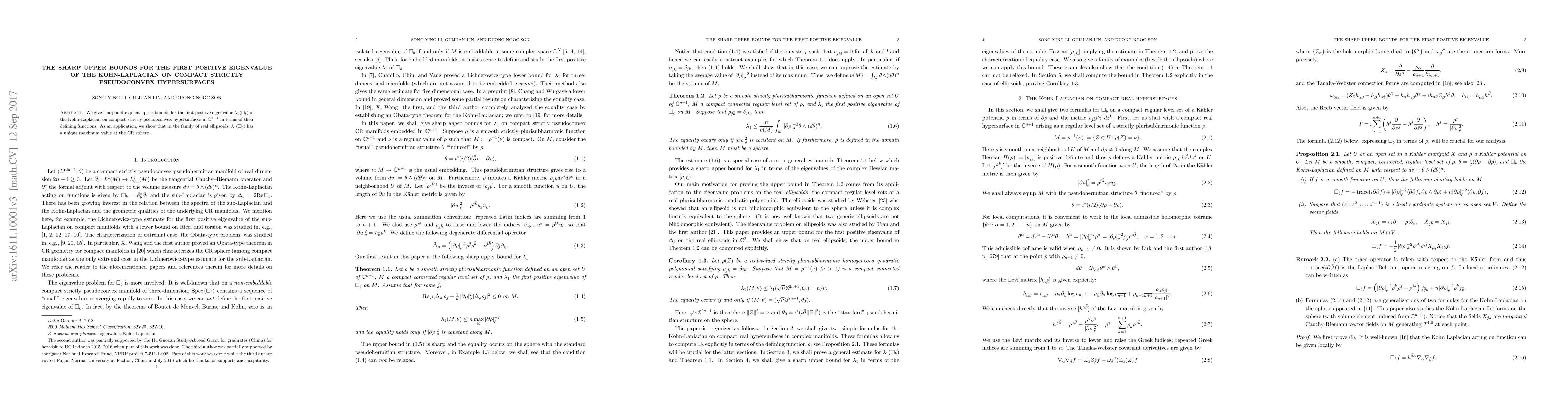 This paper establishes sharp upper bounds for the first positive eigenvalue of the Kohn-Laplacian on compact strictly pseudoconvex hypersurfaces in $\mathbb{C}^{n+1}$, expressed in terms of their defining functions. It also demonstrates that among real ellipsoids, the Kohn-Laplacian's first positive eigenvalue reaches its unique maximum on CR spheres.