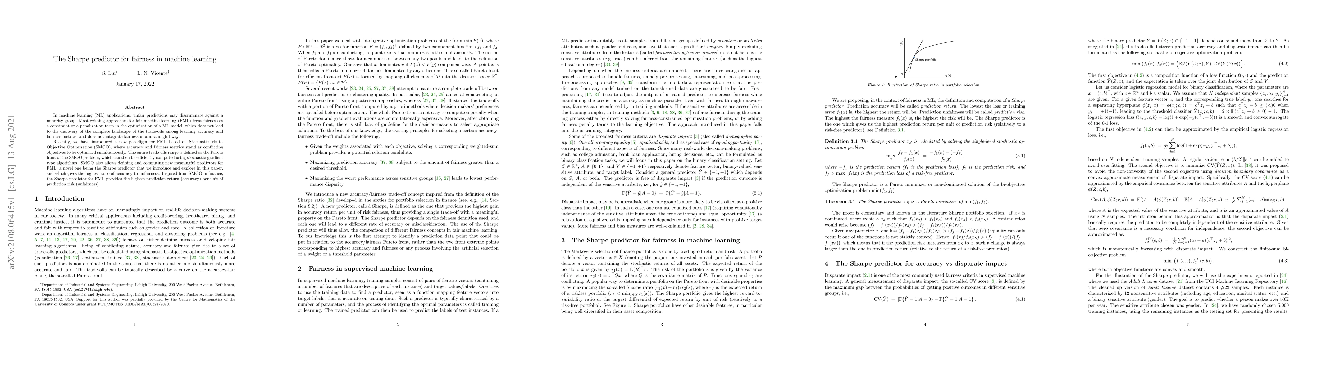 This paper proposes the Sharpe predictor within a Stochastic Multi-Objective Optimization framework to optimize both accuracy and fairness in machine learning, offering a new method to balance these conflicting objectives by maximizing the accuracy-to-unfairness ratio. The approach defines the Pareto front to explore the complete trade-offs between accuracy and fairness.