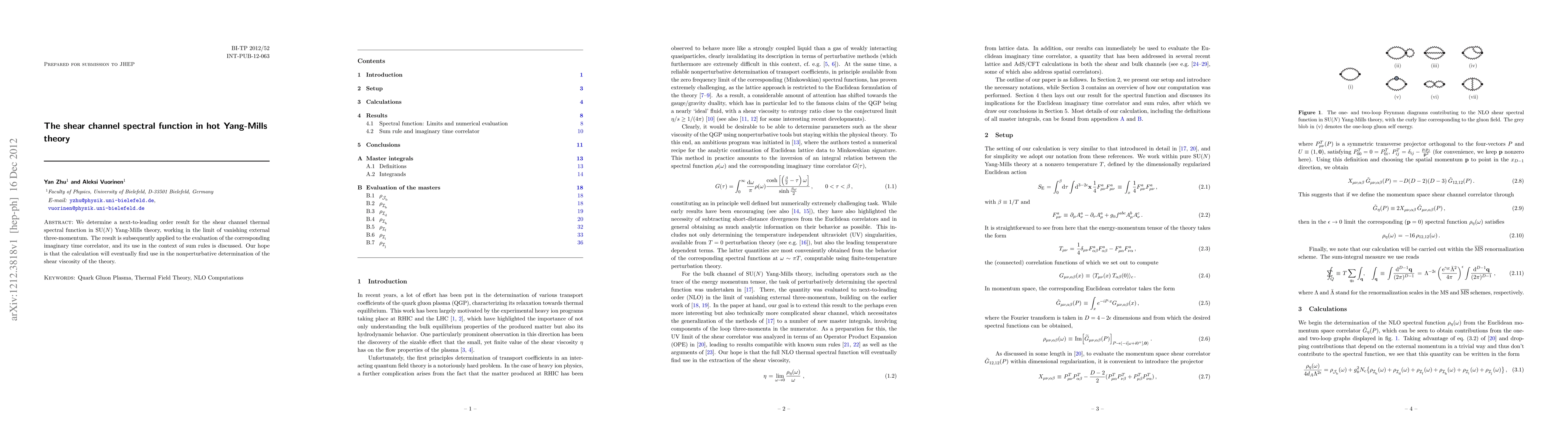 This paper calculates the next-to-leading order shear channel thermal spectral function in SU(N) Yang-Mills theory at zero external momentum, and discusses its application in evaluating imaginary time correlators and sum rules for potential use in determining the shear viscosity of the theory.