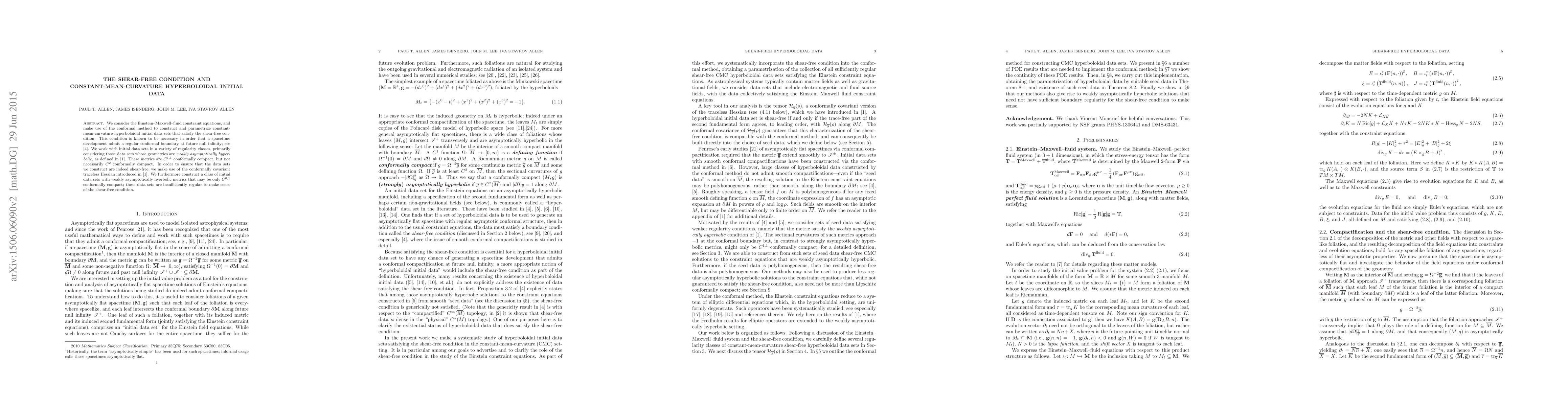 We consider the Einstein-Maxwell-fluid constraint equations, and make use of the conformal method to construct and parametrize constant-mean-curvature hyperboloidal initial data sets that satisfy the shear-free condition. This condition is known to be necessary in order that a spacetime development admit a regular conformal boundary at future null infinity. We work with initial data sets in a variety of regularity classes, primarily considering those data sets whose geometries are weakly asymptotically hyperbolic, as defined in [arXiv:1506.03399]. These metrics are $C^{1,1}$ conformally compact, but not necessarily $C^2$ conformally compact. In order to ensure that the data sets we construct are indeed shear-free, we make use of the conformally covariant traceless Hessian introduced in [arXiv:1506.03399]. We furthermore construct a class of initial data sets with weakly asymptotically hyerbolic metrics that may be only $C^{0,1}$ conformally compact; these data sets are insufficiently regular to make sense of the shear-free condition.