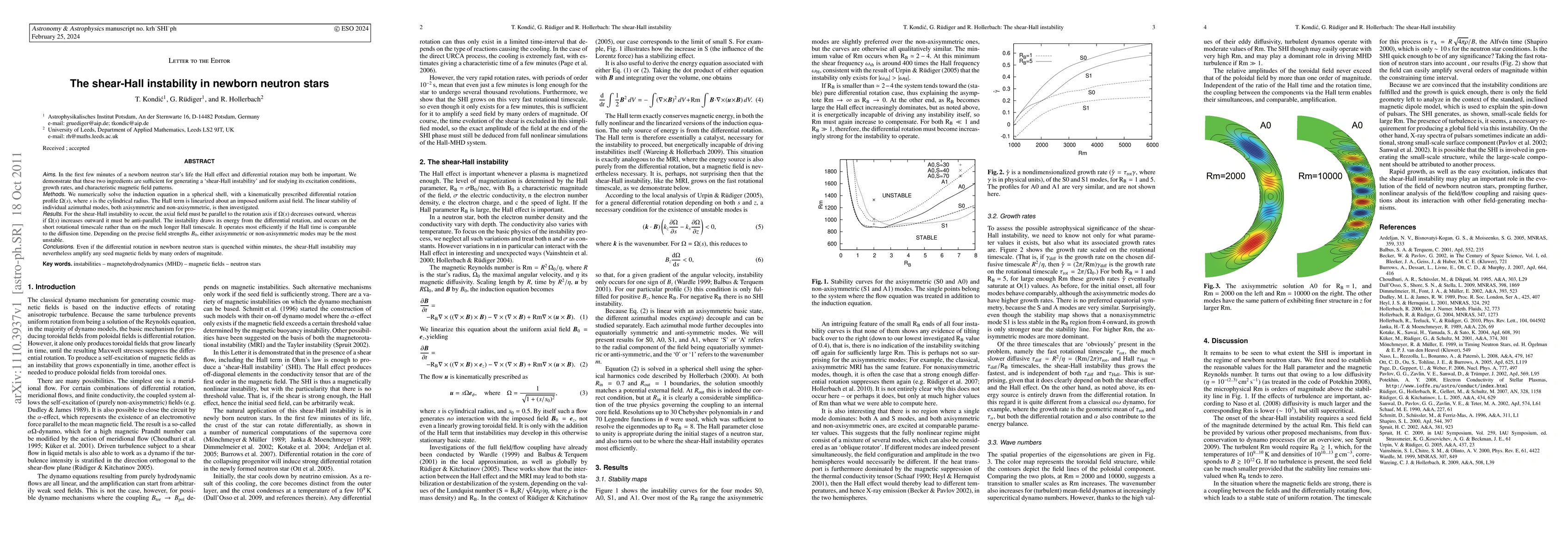 This paper investigates the shear-Hall instability in newborn neutron stars, demonstrating that the Hall effect and differential rotation can generate this instability. The study finds that the axial magnetic field must align with the rotation axis for the instability to occur, and it can amplify seed magnetic fields significantly despite rapid decay of differential rotation.
