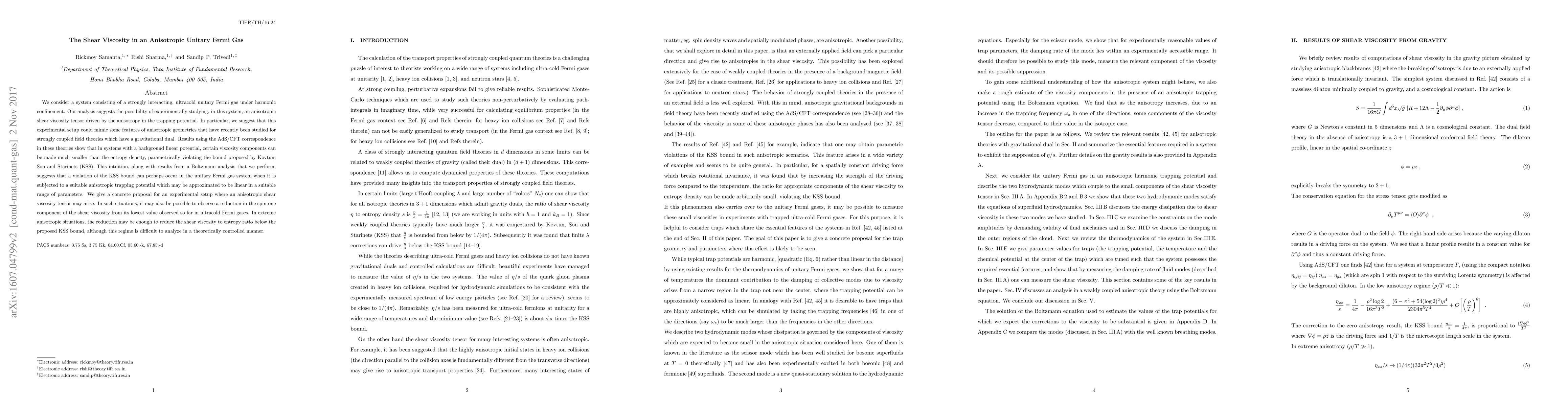 This paper investigates the shear viscosity in a strongly interacting, anisotropic unitary Fermi gas under harmonic confinement, proposing an experimental setup to study its anisotropic shear viscosity. The study suggests that the system could exhibit features similar to anisotropic geometries in strongly coupled field theories, potentially violating the KSS bound on viscosity.