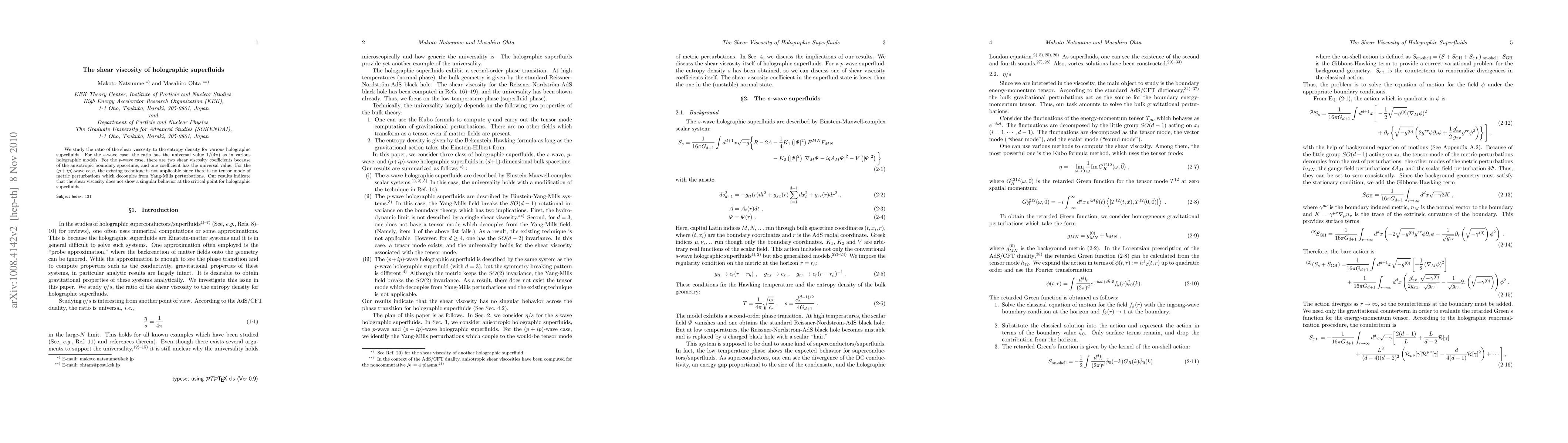 This research explores the shear viscosity to entropy density ratio in holographic superfluids, finding universal values for s-wave and p-wave cases, while the (p+ip)-wave case lacks separable metric perturbations, and it concludes that shear viscosity does not exhibit singular behavior at the critical point.