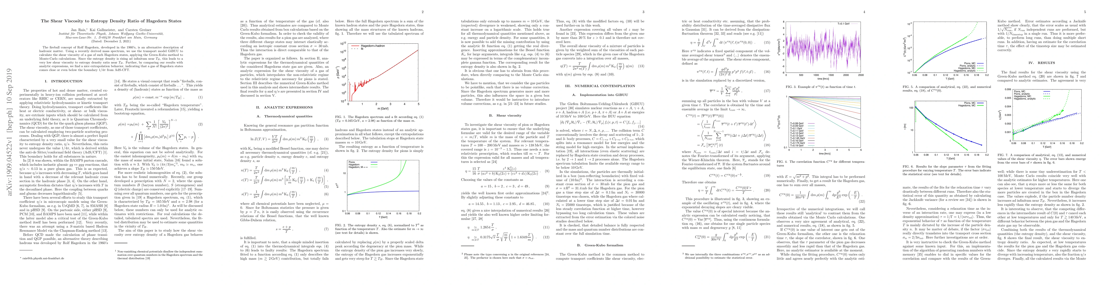 This paper investigates the shear viscosity to entropy density ratio of Hagedorn states in a gas of hadronic matter using the GiBUU transport model and the Green-Kubo method. The study finds a very low ratio near the Hagedorn temperature, approaching or falling below the $1/4\pi$ boundary predicted by AdS-CFT correspondence.