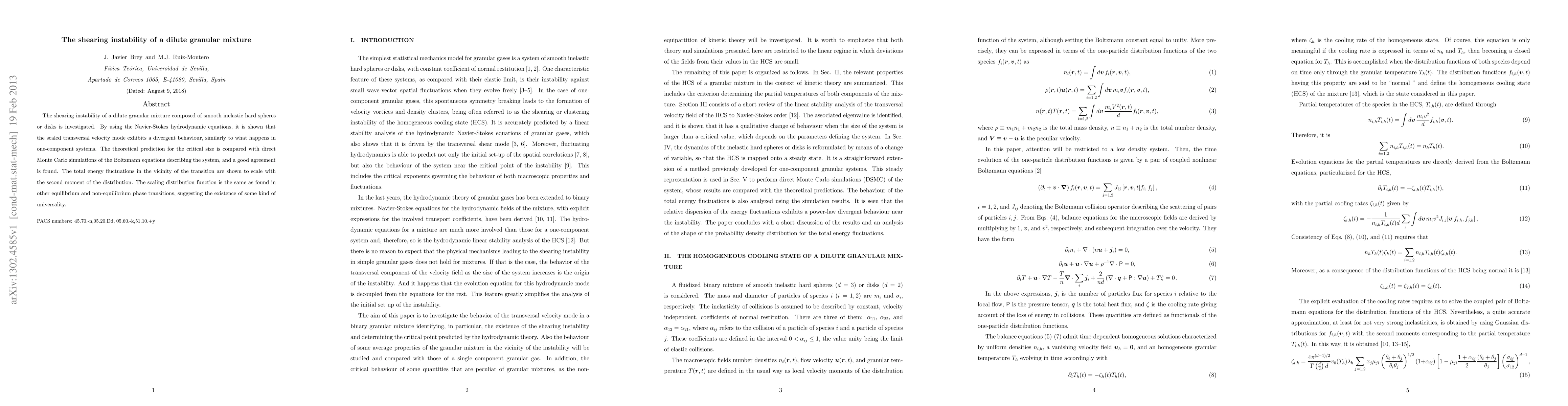 Researchers investigated the shearing instability of a dilute granular mixture using Navier-Stokes equations and found a divergent behavior similar to one-component systems. They also showed that total energy fluctuations scale with the second moment of the distribution, suggesting universality in phase transitions.