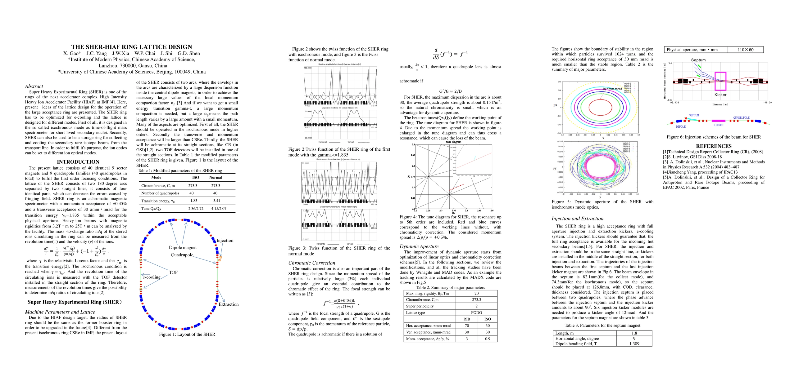 Super Heavy Experimental Ring (SHER) is one of the rings of the next accelerator complex High Intensity Heavy Ion Accelerator Facility (HIAF) at IMP[4]. Here, present ideas of the lattice design for the operation of the large acceptance ring are presented. The SHER ring has to be optimized for e-cooling and the lattice is designed for different modes. First of all, it is designed in the so called isochronous mode as time-of-flight mass spectrometer for short-lived secondary nuclei. Secondly, SHER can also be used to be a storage ring for collecting and cooling the secondary rare isotope beams from the transport line. In order to fulfil it's purpose, the ion optics can be set to different ion optical modes.