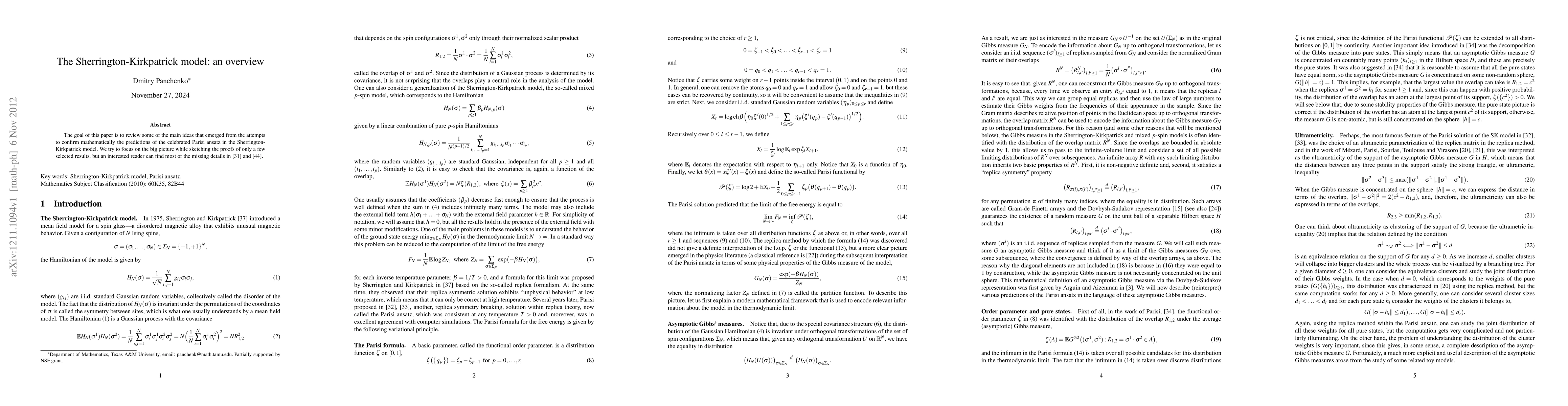 This paper provides an overview of the main ideas behind the mathematical confirmation of the Parisi ansatz in the Sherrington-Kirkpatrick model, highlighting key results while directing readers to detailed proofs in referenced sources. It aims to present the broader picture without exhaustive technical details.