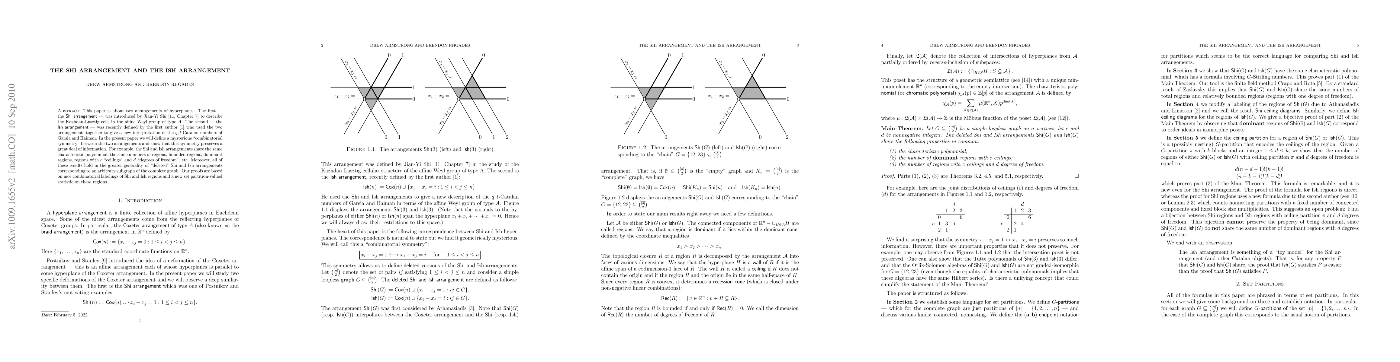 This paper is about two arrangements of hyperplanes. The first --- the Shi arrangement --- was introduced by Jian-Yi Shi to describe the Kazhdan-Lusztig cells in the affine Weyl group of type $A$. The second --- the Ish arrangement --- was recently defined by the first author who used the two arrangements together to give a new interpretation of the $q,t$-Catalan numbers of Garsia and Haiman. In the present paper we will define a mysterious "combinatorial symmetry" between the two arrangements and show that this symmetry preserves a great deal of information. For example, the Shi and Ish arrangements share the same characteristic polynomial, the same numbers of regions, bounded regions, dominant regions, regions with $c$ "ceilings" and $d$ "degrees of freedom", etc. Moreover, all of these results hold in the greater generality of "deleted" Shi and Ish arrangements corresponding to an arbitrary subgraph of the complete graph. Our proofs are based on nice combinatorial labelings of Shi and Ish regions and a new set partition-valued statistic on these regions.
