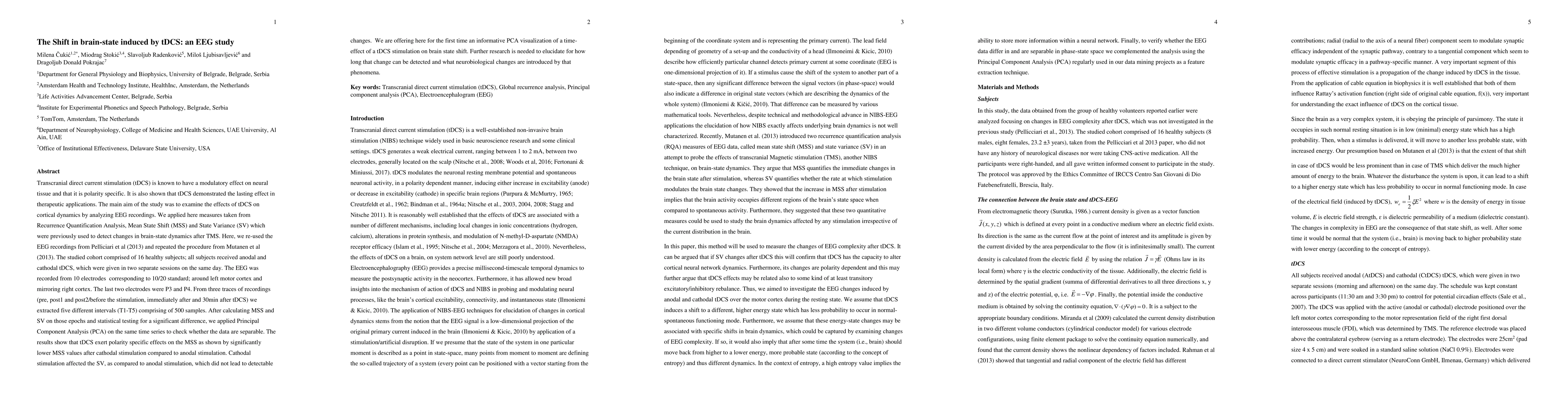 Transcranial direct current stimulation (tDCS) is known to have a modulatory effect on neural tissue and that it is polarity specific. It is also shown that tDCS demonstrated the lasting effect in therapeutic applications. The main aim of the study was to examine the effects of tDCS on cortical dynamics by analyzing EEG recordings. We applied here measures taken from Recurrence Quantification Analysis, Mean State Shift (MSS) and State Variance (SV) which were previously used to detect changes in brain-state dynamics after TMS. The studied cohort comprised of 16 healthy subjects; all subjects received anodal and cathodal tDCS, which were given in two separate sessions on the same day. The EEG was recorded from 10 electrodes, positioned over left motor cortex and mirroring right cortex corresponding to 10/20 standard. From three traces of recordings (pre, post1 and post2/before the stimulation, immediately after and 30min after tDCS) we extracted five different intervals (T1-T5) comprising of 500 samples. After calculating MSS and SV on those epochs and statistical testing for a significant difference, we applied Principal Component Analysis (PCA) on the same time series to check whether the data are separable. The results show that tDCS exert polarity specific effects on the MSS as shown by significantly lower MSS values after cathodal stimulation compared to anodal stimulation. Cathodal stimulation affected the SV, as compared to anodal stimulation, which did not lead to detectable changes. We are offering here for the first time an informative PCA visualization of a time-effect of a tDCS stimulation on brain state shift. Further research is needed to elucidate for how long that change can be detected and what neurobiological changes are introduced by that phenomena.