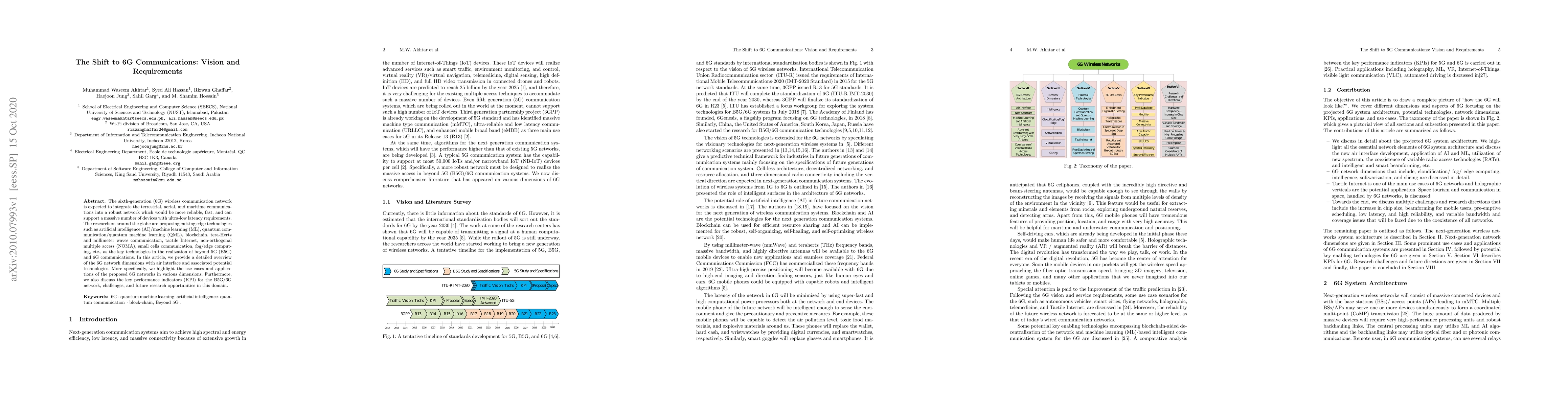 The sixth-generation (6G) wireless communication network is expected to integrate the terrestrial, aerial, and maritime communications into a robust network which would be more reliable, fast, and can support a massive number of devices with ultra-low latency requirements. The researchers around the globe are proposing cutting edge technologies such as artificial intelligence (AI)/machine learning (ML), quantum communication/quantum machine learning (QML), blockchain, tera-Hertz and millimeter waves communication, tactile Internet, non-orthogonal multiple access (NOMA), small cells communication, fog/edge computing, etc., as the key technologies in the realization of beyond 5G (B5G) and 6G communications. In this article, we provide a detailed overview of the 6G network dimensions with air interface and associated potential technologies. More specifically, we highlight the use cases and applications of the proposed 6G networks in various dimensions. Furthermore, we also discuss the key performance indicators (KPI) for the B5G/6G network, challenges, and future research opportunities in this domain.