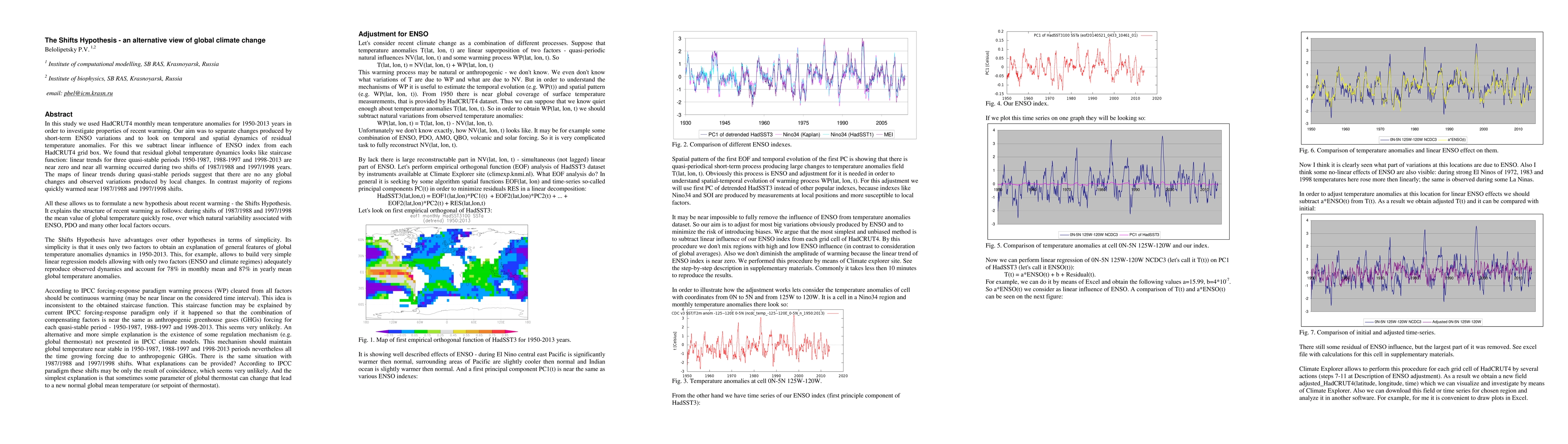 In this study we used HadCRUT4 temperature anomalies for 1950-2013 years in order to investigate properties of recent warming. Our aim was to separate changes produced by short-term ENSO variations and to look on temporal and spatial dynamics of residual temperature anomalies. For this we subtract linear influence of ENSO index from each HadCRUT4 grid box. We found that residual global temperature dynamics looks like staircase function: linear trends for three quasi-stable periods 1950-1987, 1988-1997 and 1998-2013 are near zero and near all warming occurred during two shifts of 1987/1988 and 1997/1998 years. All these allows us to formulate a new hypothesis about recent warming - the Shifts Hypothesis. It explains the structure of recent warming as follows: during shifts of 1987/1988 and 1997/1998 the mean value of global temperature quickly rose, over which natural variability associated with ENSO, PDO and many other local factors occurs. According to IPCC forcing-response paradigm warming process (WP) cleared from all factors should be continuous warming (may be near linear on the considered time interval). This idea is inconsistent to the obtained staircase function. This staircase function may be explained by current IPCC forcing-response paradigm only if it happened so that the combination of compensating factors is near the same as anthropogenic greenhouse gases (GHGs) forcing for each quasi-stable period - 1950-1987, 1988-1997 and 1998-2013. This seems very unlikely. An alternative and more simple explanation is the existence of some regulation mechanism (e.g. global thermostat) not presented in IPCC climate models. This mechanism should maintain global temperature near stable in 1950-1987, 1988-1997 and 1998-2013 periods nevertheless all the time growing forcing due to anthropogenic GHGs.