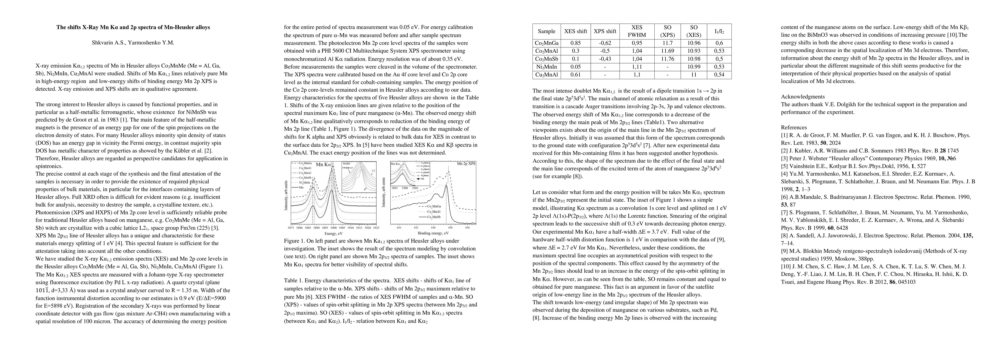 This study investigates the shifts in X-ray Mn Kα1,2 emission spectra and Mn 2p XPS spectra in various Mn-Heusler alloys, revealing high-energy shifts in Kα lines and low-energy shifts in 2p binding energy compared to pure Mn, with both techniques showing qualitative agreement.