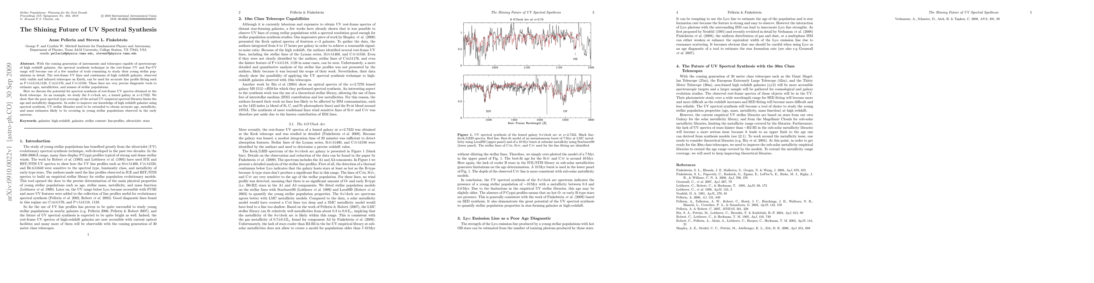 With the coming generation of instruments and telescopes capable of spectroscopy of high redshift galaxies, the spectral synthesis technique in the rest-frame UV and Far-UV range will become one of a few number of tools remaining to study their young stellar populations in detail. The rest-frame UV lines and continuum of high redshift galaxies, observed with visible and infrared telescopes on Earth, can be used for accurate line profile fitting such as PV@1118,1128A, CIII@1176A, and CIV@1550A. These lines are very precise diagnostic tools to estimate ages, metallicities, and masses of stellar populations. Here we discuss the potential for spectral synthesis of rest-frame UV spectra obtained at the Keck telescope. As an example, we study the 8 o'clock arc, a lensed galaxy at z=2.7322. We show that the poor spectral type coverage of the actual UV empirical spectral libraries limits the age and metallicity diagnostic. In order to improve our knowledge of high redshift galaxies using spectral synthesis, UV stellar libraries need to be extended to obtain accurate age, metallicity, and mass estimates likely to be occuring in young stellar populations observed in the early universe.