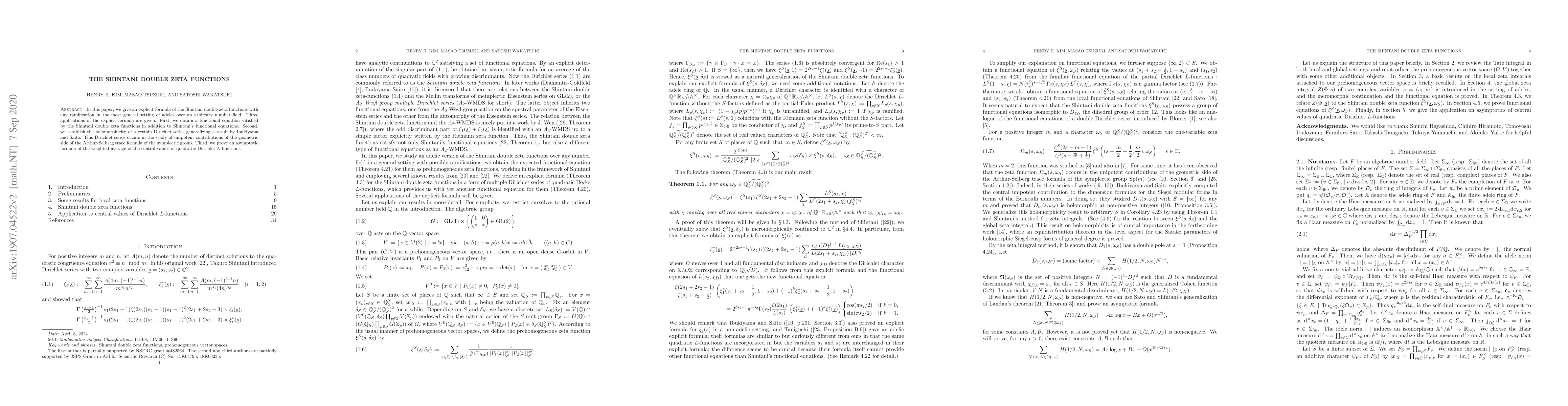 This paper presents an explicit formula for Shintani double zeta functions in adeles over number fields, providing a functional equation, proving the holomorphicity of a Dirichlet series, and deriving an asymptotic formula for central values of quadratic Dirichlet L-functions.