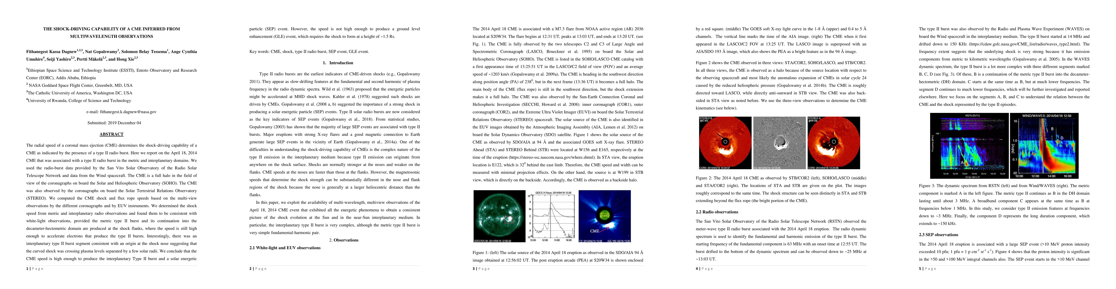 This study investigates the shock-driving capability of a coronal mass ejection (CME) observed on April 18, 2014, using multiwavelength data from various observatories. The high radial speed of the CME, inferred from the presence of a type II radio burst, indicates it produced a shock capable of generating interplanetary type II bursts and solar energetic particles, but not a ground level enhancement.