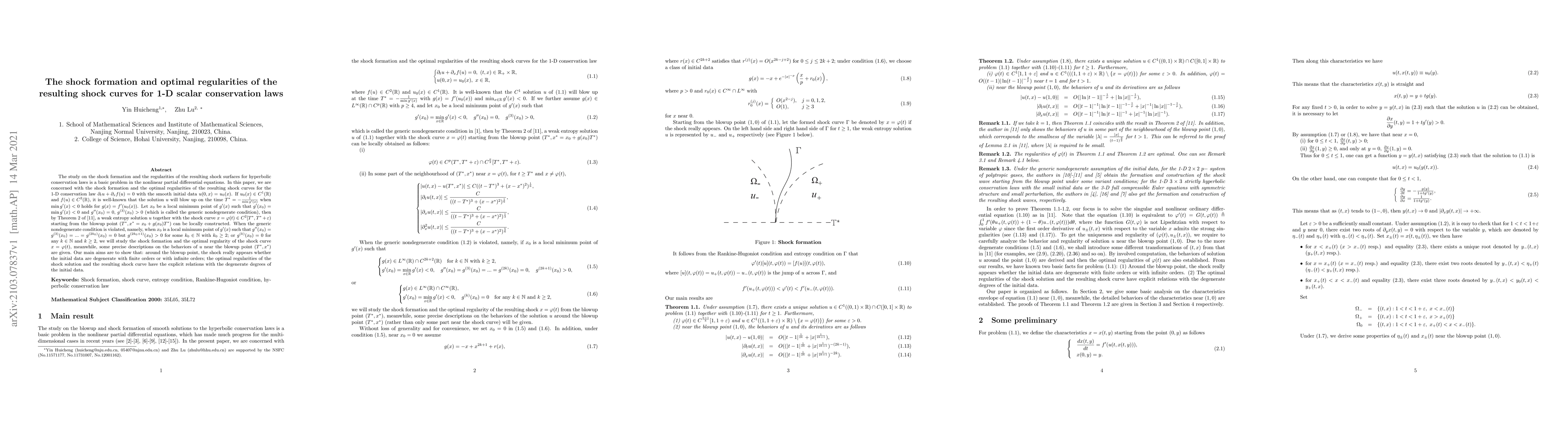 The study on the shock formation and the regularities of the resulting shock surfaces for hyperbolic conservation laws is a basic problem in the nonlinear partial differential equations. In this paper, we are concerned with the shock formation and the optimal regularities of the resulting shock curves for the 1-D conservation law $\partial_tu+\partial_xf(u)=0$ with the smooth initial data $u(0,x)=u_0(x)$. If $u_0(x)\in C^{1}(\Bbb R)$ and $f(u)\in C^2(\Bbb R)$, it is well-known that the solution $u$ will blow up on the time $T^*=-\frac{1}{\min{g'(x)}}$ when $\min{g'(x)}<0$ holds for $g(x)=f'(u_0(x))$. Let $x_0$ be a local minimum point of $g'(x)$ such that $g'(x_0)=\min{g'(x)}<0$ and $g''(x_0)=0$, $g^{(3)}(x_0)>0$ (which is called the generic nondegenerate condition), then by Theorem 2 of \cite{Le94}, a weak entropy solution $u$ together with the shock curve $x=\varphi(t)\in C^2[T^*, T^*+\varepsilon)$ starting from the blowup point $(T^*, x^*=x_0+g(x_0)T^*)$ can be locally constructed. When the generic nondegenerate condition is violated, namely, when $x_0$ is a local minimum point of $g'(x)$ such that $g''(x_0)=g^{(3)}(x_0)=...=g^{(2k_0)}(x_0)=0$ but $g^{(2k_0+1)}(x_0)>0$ for some $k_0\in\Bbb N$ with $k_0\ge 2$; or $g^{(k)}(x_0)=0$ for any $k\in\Bbb N$ and $k\ge 2$, we will study the shock formation and the optimal regularity of the shock curve $x=\varphi(t)$, meanwhile, some precise descriptions on the behaviors of $u$ near the blowup point $(T^*, x^*)$ are given. Our main aims are to show that: around the blowup point, the shock really appears whether the initial data are degenerate with finite orders or with infinite orders; the optimal regularities of the shock solution and the resulting shock curve have the explicit relations with the degenerate degrees of the initial data.
