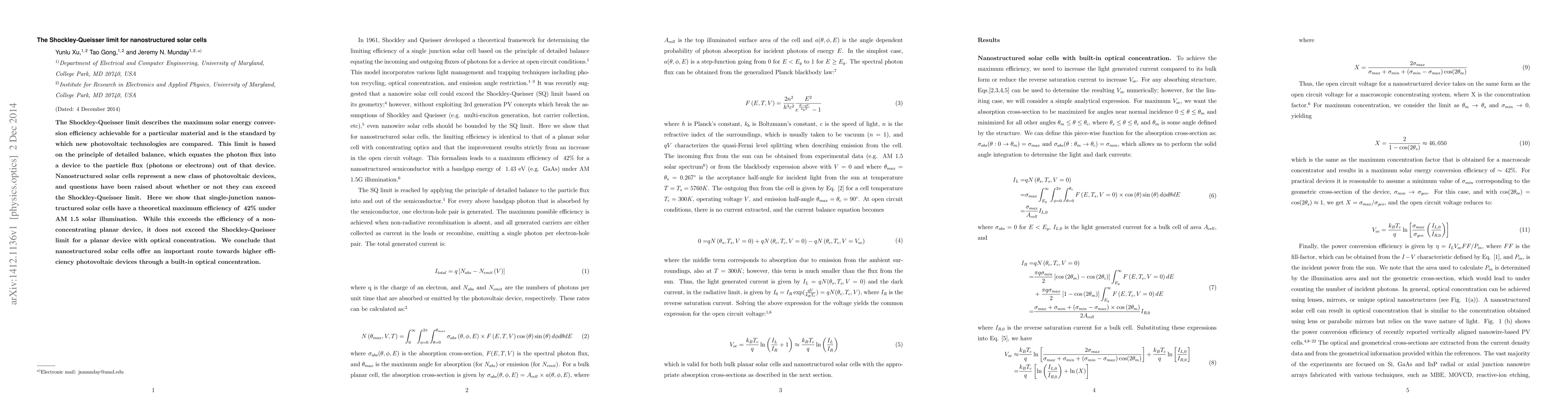 This paper investigates the potential of nanostructured solar cells to surpass the Shockley-Queisser limit, finding that while they can achieve a theoretical maximum efficiency of 42%, this does not exceed the limit when considering optical concentration in planar devices. Thus, nanostructured solar cells offer a pathway to higher efficiency through inherent optical concentration.