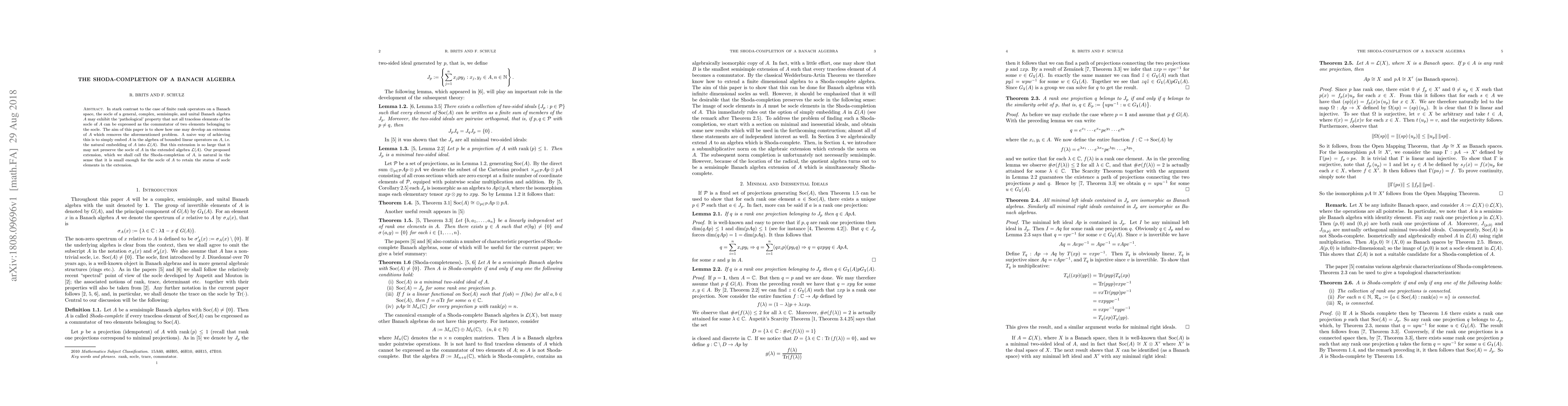 In stark contrast to the case of finite rank operators on a Banach space, the socle of a general, complex, semisimple, and unital Banach algebra $A$ may exhibit the `pathological' property that not all traceless elements of the socle of $A$ can be expressed as the commutator of two elements belonging to the socle. The aim of this paper is to show how one may develop an extension of $A$ which removes the aforementioned problem. A naive way of achieving this is to simply embed $A$ in the algebra of bounded linear operators on $A$, i.e. the natural embedding of $A$ into $\mathcal L(A)$. But this extension is so large that it may not preserve the socle of $A$ in the extended algebra $\mathcal L(A)$. Our proposed extension, which we shall call the Shoda-completion of $A$, is natural in the sense that it is small enough for the socle of $A$ to retain the status of socle elements in the extension.