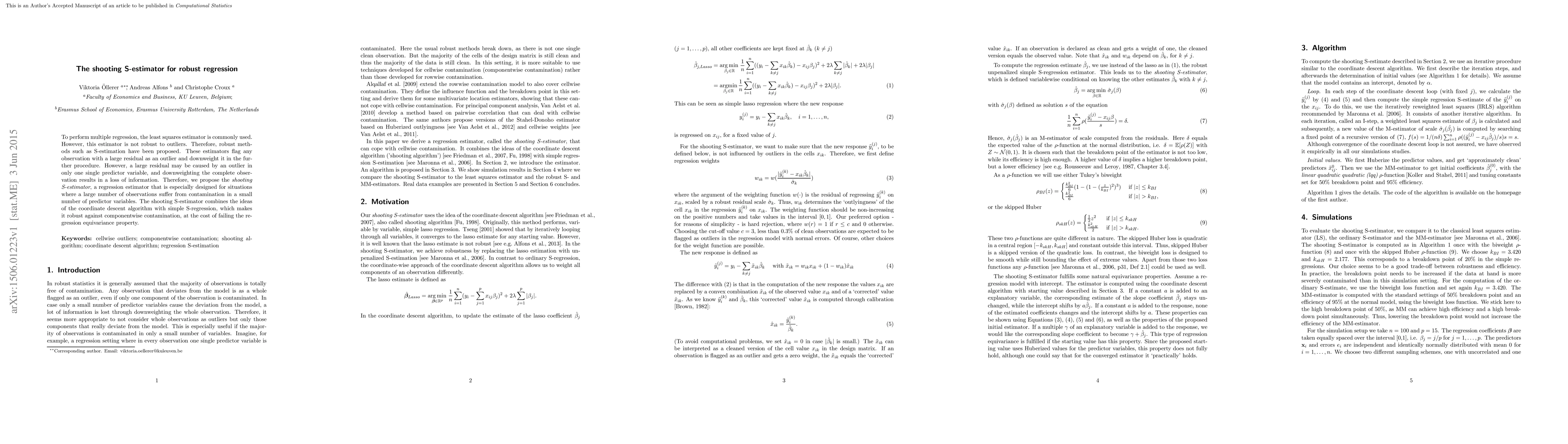To perform multiple regression, the least squares estimator is commonly used. However, this estimator is not robust to outliers. Therefore, robust methods such as S-estimation have been proposed. These estimators flag any observation with a large residual as an outlier and downweight it in the further procedure. However, a large residual may be caused by an outlier in only one single predictor variable, and downweighting the complete observation results in a loss of information. Therefore, we propose the shooting S-estimator, a regression estimator that is especially designed for situations where a large number of observations suffer from contamination in a small number of predictor variables. The shooting S-estimator combines the ideas of the coordinate descent algorithm with simple S-regression, which makes it robust against componentwise contamination, at the cost of failing the regression equivariance property.