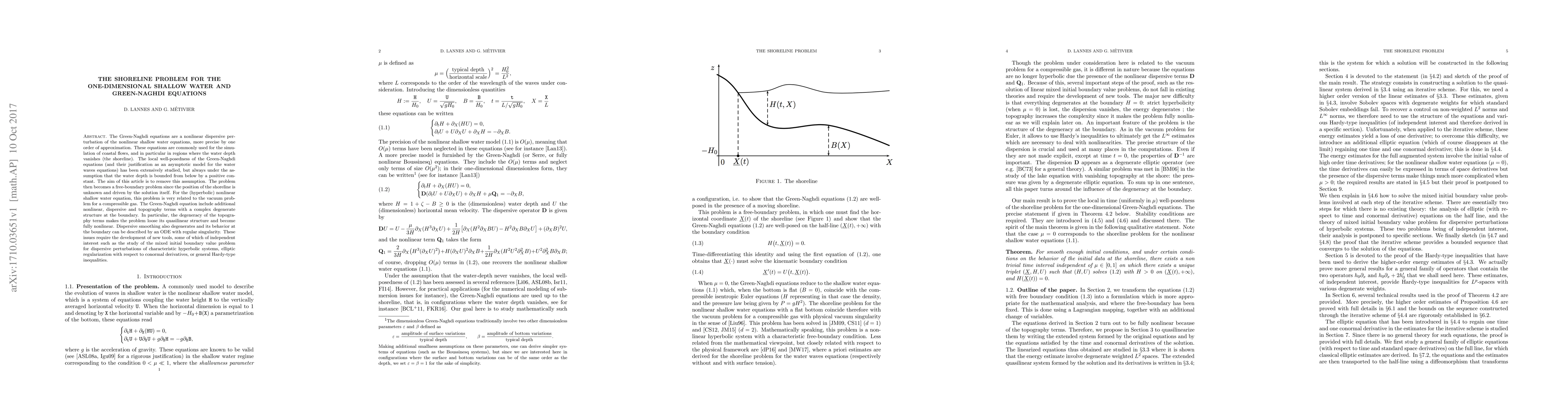 The Green-Naghdi equations are a nonlinear dispersive perturbation of the nonlinear shallow water equations, more precise by one order of approximation. These equations are commonly used for the simulation of coastal flows, and in particular in regions where the water depth vanishes (the shoreline). The local well-posedness of the Green-Naghdi equations (and their justification as an asymptotic model for the water waves equations) has been extensively studied, but always under the assumption that the water depth is bounded from below by a positive constant. The aim of this article is to remove this assumption. The problem then becomes a free-boundary problem since the position of the shoreline is unknown and driven by the solution itself. For the (hyperbolic) nonlinear shallow water equation, this problem is very related to the vacuum problem for a compressible gas. The Green-Naghdi equation include additional nonlinear, dispersive and topography terms with a complex degenerate structure at the boundary. In particular, the degeneracy of the topography terms makes the problem loose its quasilinear structure and become fully nonlinear. Dispersive smoothing also degenerates and its behavior at the boundary can be described by an ODE with regular singularity. These issues require the development of new tools, some of which of independent interest such as the study of the mixed initial boundary value problem for dispersive perturbations of characteristic hyperbolic systems, elliptic regularization with respect to conormal derivatives, or general Hardy-type inequalities.
