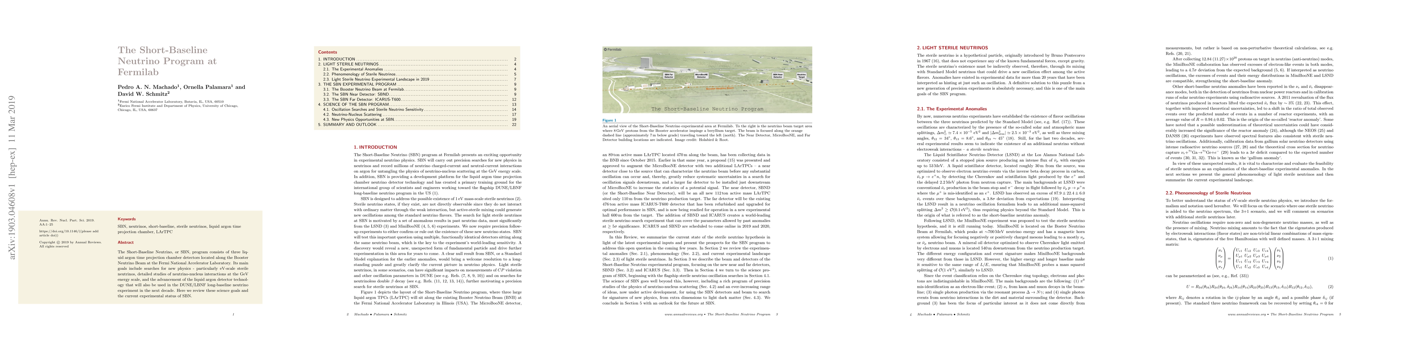 The Short-Baseline Neutrino, or SBN, program consists of three liquid argon time projection chamber detectors located along the Booster Neutrino Beam at the Fermi National Accelerator Laboratory. Its main goals include searches for new physics - particularly eV-scale sterile neutrinos, detailed studies of neutrino-nucleus interactions at the GeV energy scale, and the advancement of the liquid argon detector technology that will also be used in the DUNE/LBNF long-baseline neutrino experiment in the next decade. Here we review these science goals and the current experimental status of SBN.