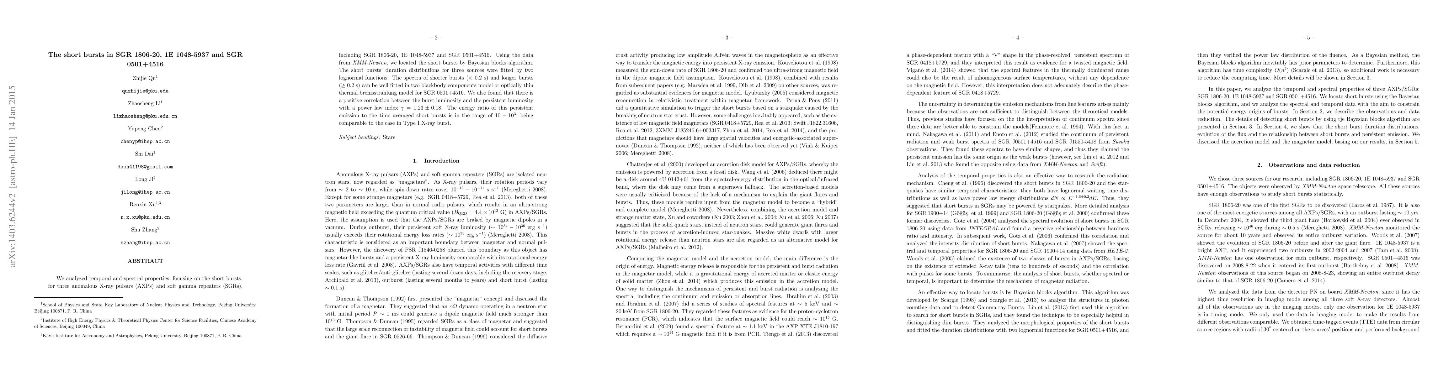 We analyzed temporal and spectral properties, focusing on the short bursts, for three anomalous X-ray pulsars (AXPs) and soft gamma repeaters (SGRs), including SGR 1806-20, 1E 1048-5937 and SGR 0501+4516. Using the data from XMM-Newton, we located the short bursts by Bayesian blocks algorithm. The short bursts' duration distributions for three sources were fitted by two lognormal functions. The spectra of shorter bursts ($< 0.2~\rm s$) and longer bursts ($\geq 0.2~\rm s$) can be well fitted in two blackbody components model or optically thin thermal bremsstrahlung model for SGR 0501+4516. We also found that there is a positive correlation between the burst luminosity and the persistent luminosity with a power law index $\gamma = 1.23 \pm 0.18 $. The energy ratio of this persistent emission to the time averaged short bursts is in the range of $10 - 10^3$, being comparable to the case in Type I X-ray burst.
