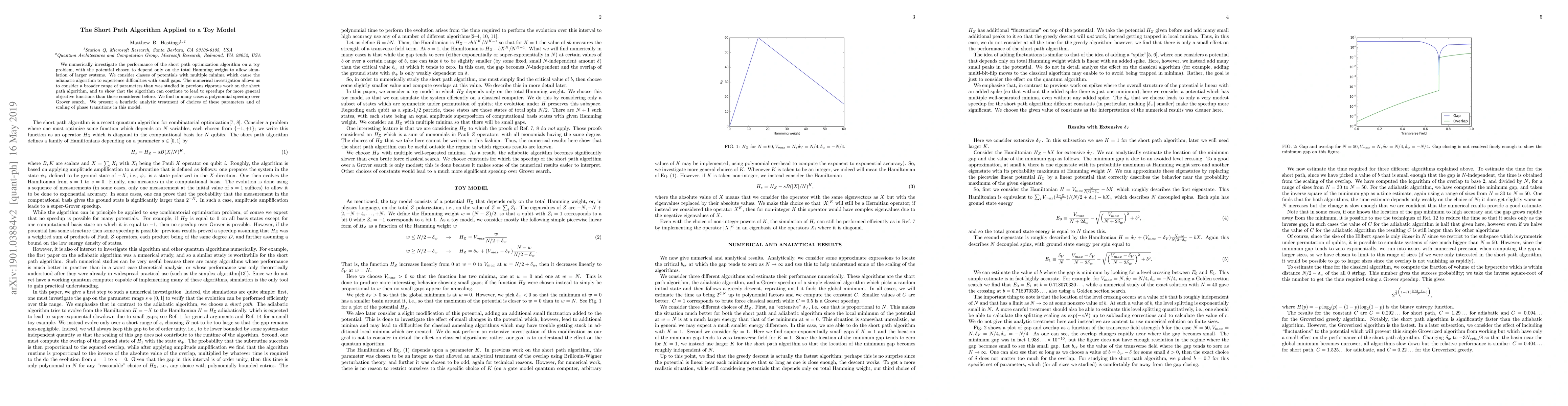 Researchers investigated the performance of the short path algorithm on a simplified model with multiple minima, finding polynomial speedups over Grover search in many cases.