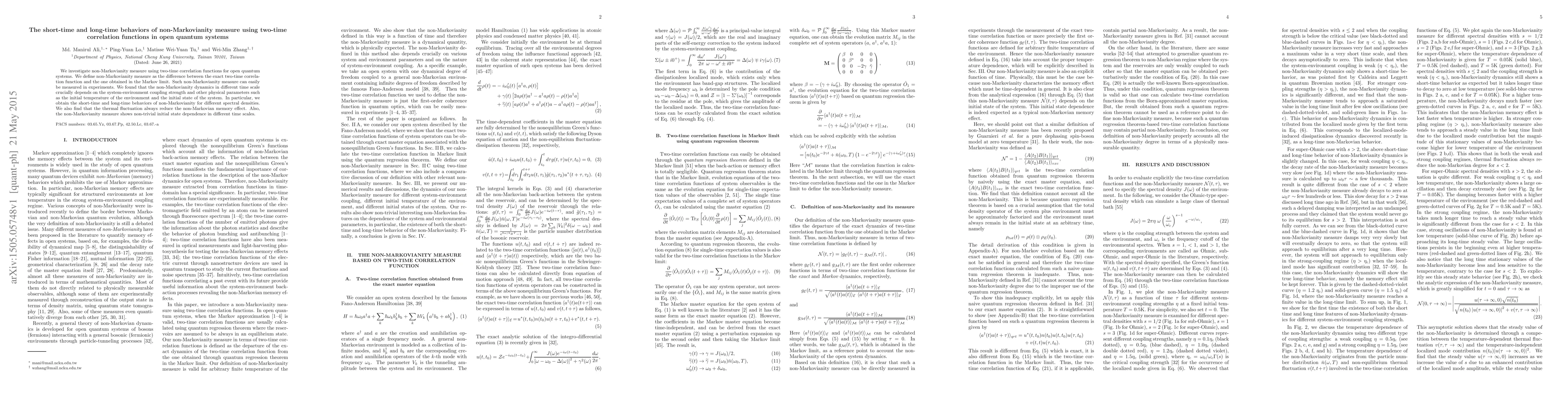This paper investigates the non-Markovianity measure in open quantum systems using two-time correlation functions, revealing its dependence on system-environment coupling strength and initial conditions. It finds that non-Markovianity exhibits distinct short-time and long-time behaviors influenced by thermal fluctuations and initial state dependencies.