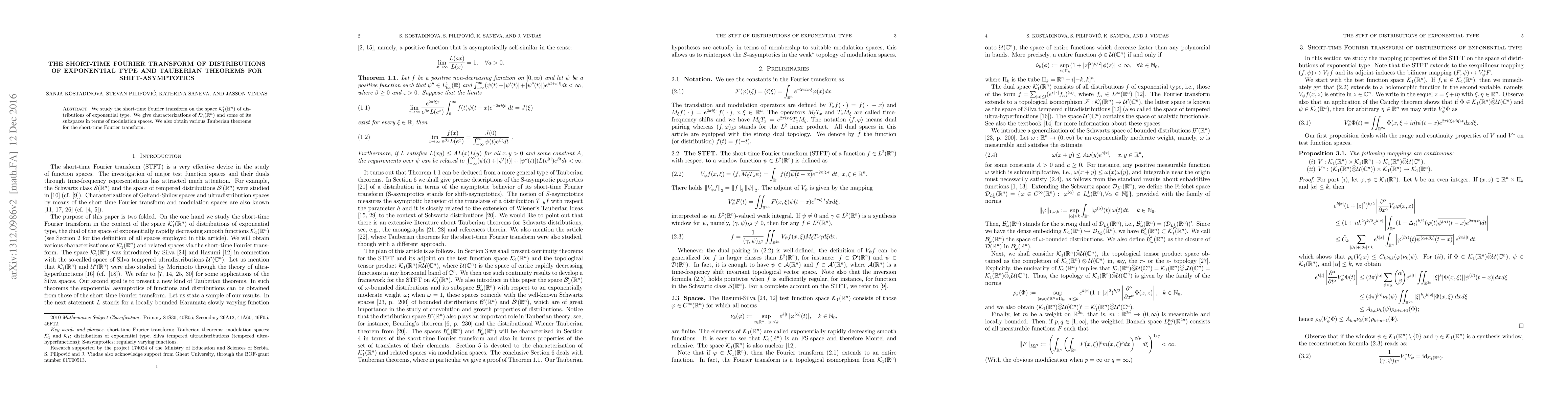 This paper explores the short-time Fourier transform on distributions of exponential type, providing characterizations of the space $\mathcal{K}_{1}'(\mathbb{R}^n)$ and its subspaces via modulation spaces, and deriving several Tauberian theorems related to shift-asymptotics.