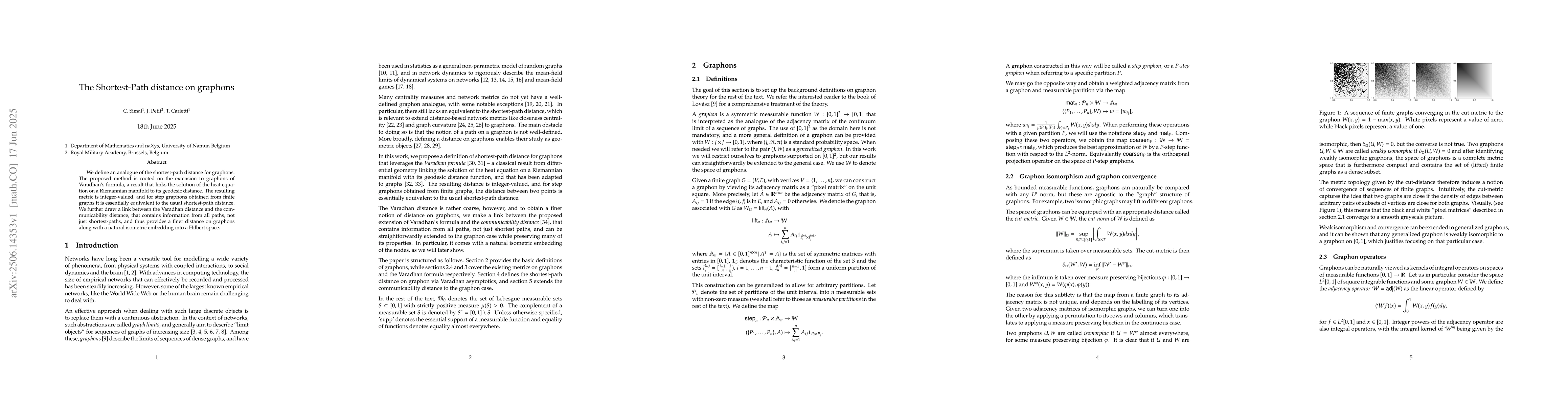 We define an analogue of the shortest-path distance for graphons. The proposed method is rooted on the extension to graphons of Varadhan's formula, a result that links the solution of the heat equation on a Riemannian manifold to its geodesic distance. The resulting metric is integer-valued, and for step graphons obtained from finite graphs it is essentially equivalent to the usual shortest-path distance. We further draw a link between the Varadhan distance and the communicability distance, that contains information from all paths, not just shortest-paths, and thus provides a finer distance on graphons along with a natural isometric embedding into a Hilbert space.
