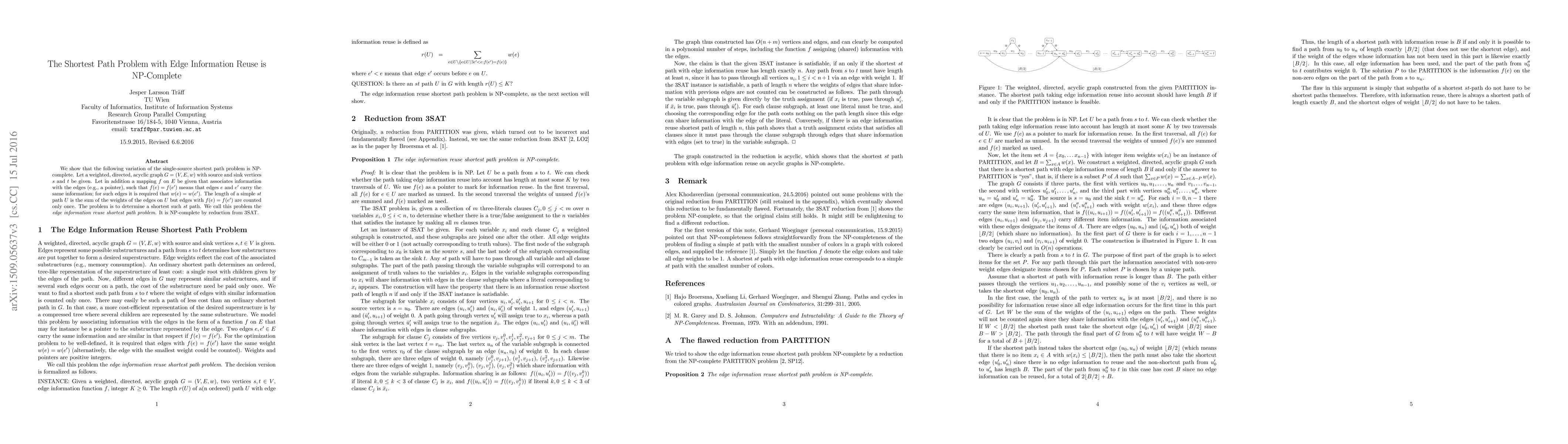This paper demonstrates that the edge information reuse shortest path problem, where edges with identical information are counted only once in the path weight, is NP-complete. The authors prove this by reducing the 3SAT problem to the proposed variation of the single-source shortest path problem.