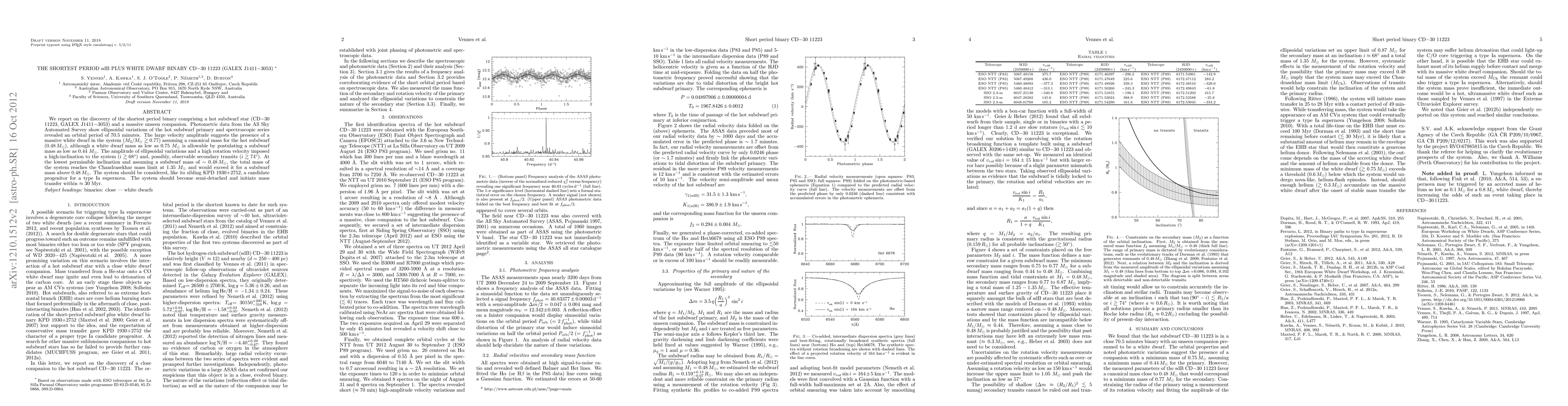 We report on the discovery of the shortest period binary comprising a hot subdwarf star (CD-30 11223, GALEX J1411-3053) and a massive unseen companion. Photometric data from the All Sky Automated Survey show ellipsoidal variations of the hot subdwarf primary and spectroscopic series revealed an orbital period of 70.5 minutes. The large velocity amplitude suggests the presence of a massive white dwarf in the system (M_2/M_sun > 0.77) assuming a canonical mass for the hot subdwarf (0.48 M_sun), although a white dwarf mass as low as 0.75 M_sun is allowable by postulating a subdwarf mass as low as 0.44 M_sun. The amplitude of ellipsoidal variations and a high rotation velocity imposed a high-inclination to the system (i > 68 deg) and, possibly, observable secondary transits (i > 74 deg). At the lowest permissible inclination and assuming a subdwarf mass of ~0.48 M_sun, the total mass of the system reaches the Chandrasekhar mass limit at 1.35 M_sun and would exceed it for a subdwarf mass above 0.48 M_sun. The system should be considered, like its sibling KPD 1930+2752, a candidate progenitor for a Type Ia supernova. The system should become semi-detached and initiate mass transfer within ~30 Myr.