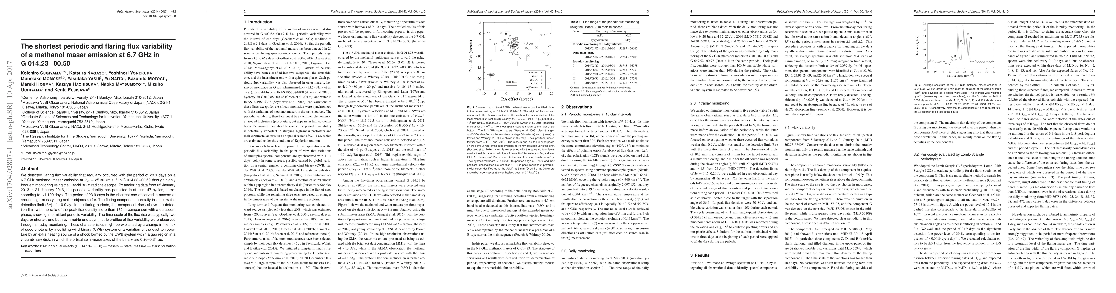 The research employed highly frequent monitoring using the Hitachi 32-m radio telescope to detect flaring flux variability in a 6.7 GHz methanol maser emission at Vlsr = 25.30 km/s in G014.23-00.50 over a period from 05 January 2013 to 21 January 2016 (MJD 56297–57408).