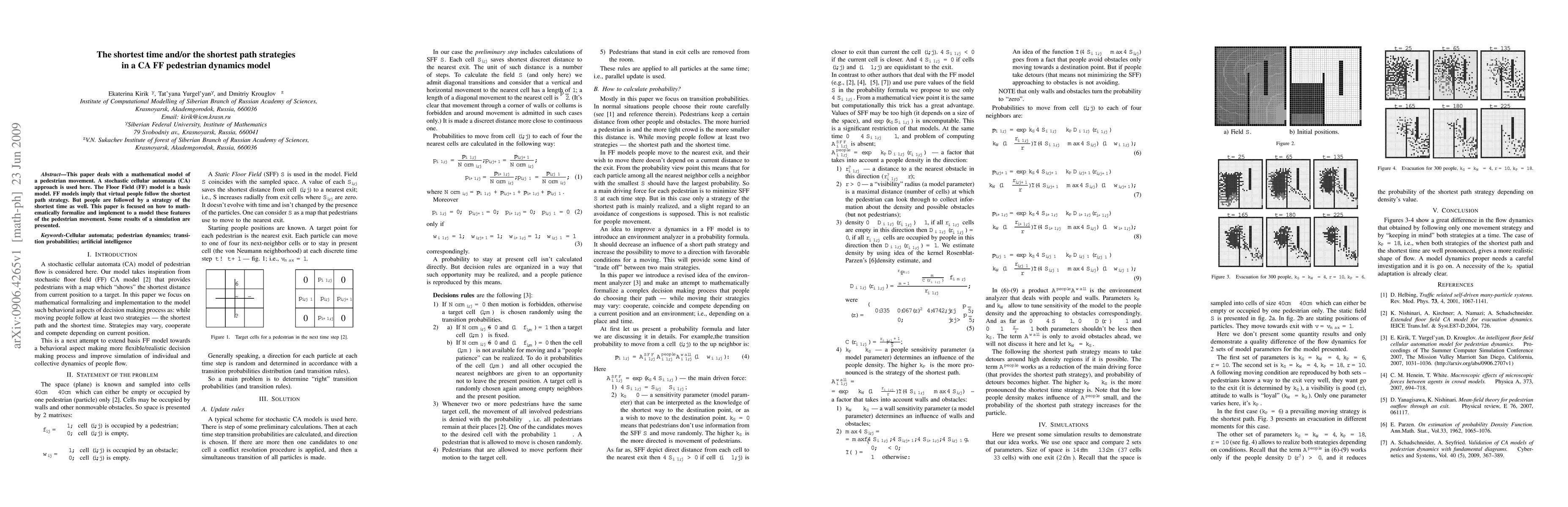 This paper develops a stochastic cellular automata model for pedestrian movement, incorporating both shortest path and shortest time strategies within the Floor Field framework, and presents simulation results to demonstrate these features.