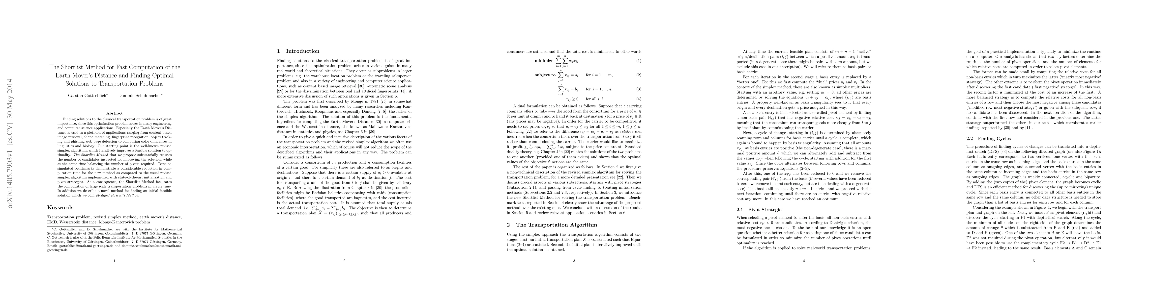 Finding solutions to the classical transportation problem is of great importance, since this optimization problem arises in many engineering and computer science applications. Especially the Earth Mover's Distance is used in a plethora of applications ranging from content-based image retrieval, shape matching, fingerprint recognition, object tracking and phishing web page detection to computing color differences in linguistics and biology. Our starting point is the well-known revised simplex algorithm, which iteratively improves a feasible solution to optimality. The Shortlist Method that we propose substantially reduces the number of candidates inspected for improving the solution, while at the same time balancing the number of pivots required. Tests on simulated benchmarks demonstrate a considerable reduction in computation time for the new method as compared to the usual revised simplex algorithm implemented with state-of-the-art initialization and pivot strategies. As a consequence, the Shortlist Method facilitates the computation of large scale transportation problems in viable time. In addition we describe a novel method for finding an initial feasible solution which we coin Modified Russell's Method.