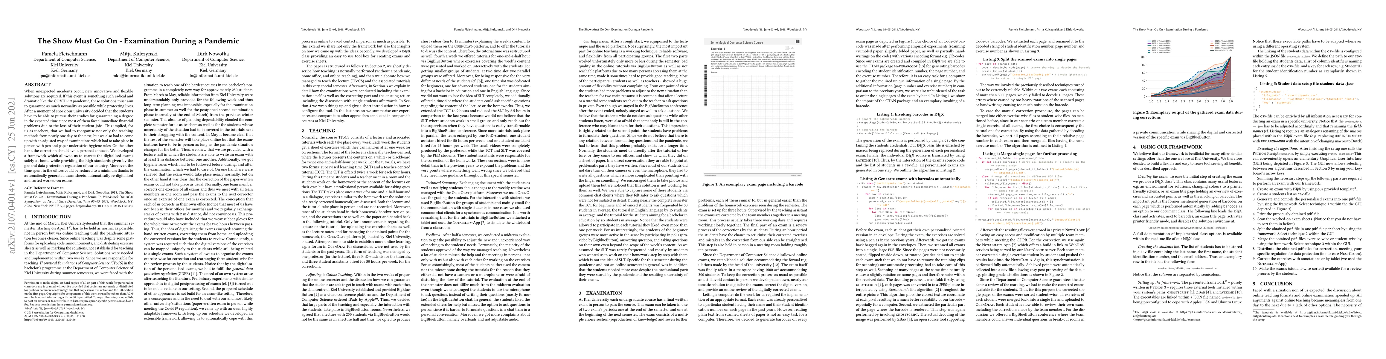 When unexpected incidents occur, new innovative and flexible solutions are required. If this event is something such radical and dramatic like the COVID-19 pandemic, these solutions must aim to guarantee as much normality as possible while protecting lives. After a moment of shock our university decided that the students have to be able to pursue their studies for guaranteeing a degree in the expected time since most of them faced immediate financial problems due to the loss of their student jobs. This implied, for us as teachers, that we had to reorganise not only the teaching methods from nearly one day to the next, but we also had to come up with an adjusted way of examinations which had to take place in person with pen and paper under strict hygiene rules. On the other hand the correction should avoid personal contacts. We developed a framework which allowed us to correct the digitalised exams safely at home while providing the high standards given by the general data protection regulation of our country. Moreover, the time spent in the offices could be reduced to a minimum thanks to automatically generated exam sheets, automatically re-digitalised and sorted worked-on exams.