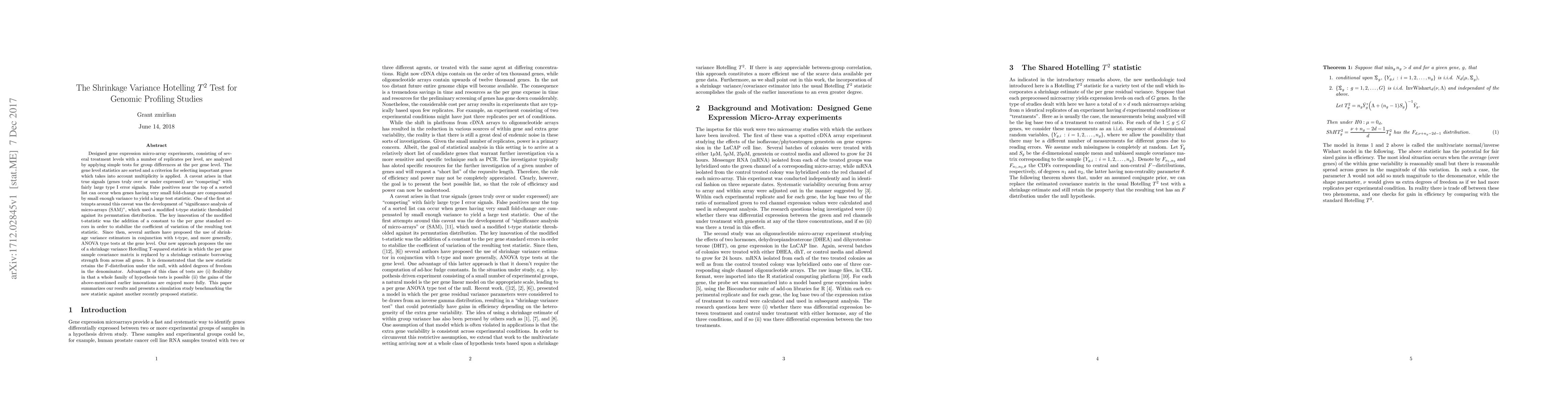 This paper introduces a new shrinkage variance Hotelling T-squared statistic for genomic profiling, which improves upon previous methods by borrowing strength from all genes to stabilize test statistics. The new approach retains the F-distribution under the null, providing added degrees of freedom in the denominator. Simulation results demonstrate its advantages over a recently proposed statistic, offering a more flexible and robust family of hypothesis tests for gene expression micro-array experiments.