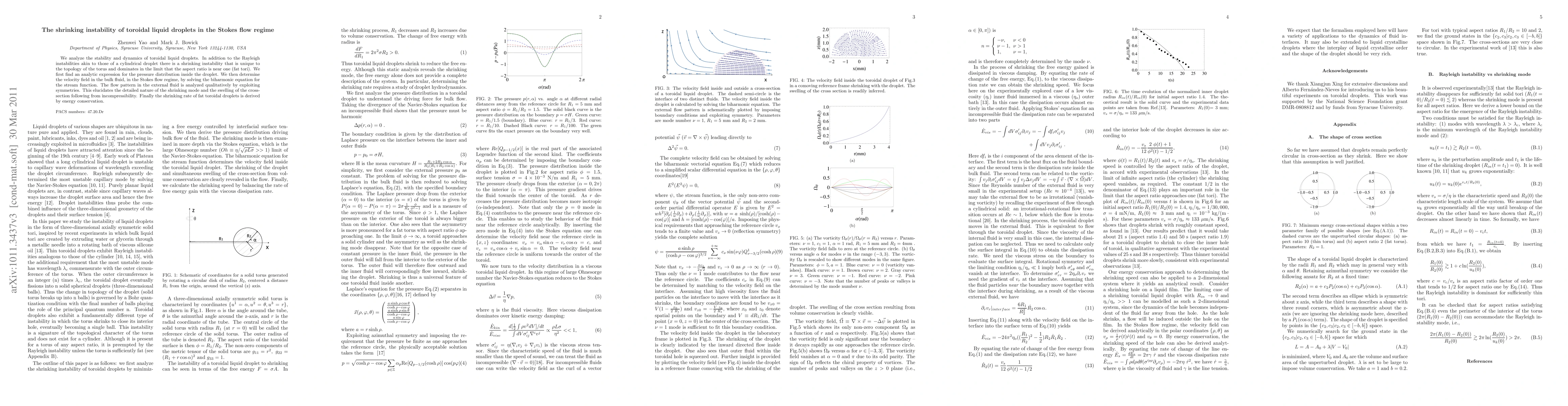 We analyze the stability and dynamics of toroidal liquid droplets. In addition to the Rayleigh instabilities akin to those of a cylindrical droplet there is a shrinking instability that is unique to the topology of the torus and dominates in the limit that the aspect ratio is near one (fat tori). We first find an analytic expression for the pressure distribution inside the droplet. We then determine the velocity field in the bulk fluid, in the Stokes flow regime, by solving the biharmonic equation for the stream function. The flow pattern in the external fluid is analyzed qualitatively by exploiting symmetries. This elucidates the detailed nature of the shrinking mode and the swelling of the cross-section following from incompressibility. Finally the shrinking rate of fat toroidal droplets is derived by energy conservation.
