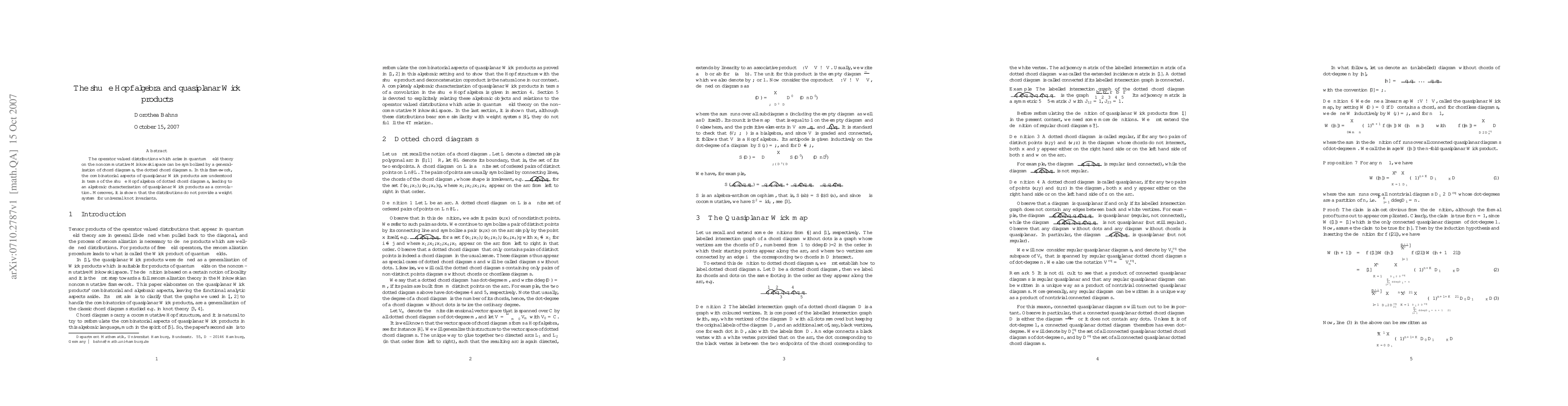 The paper introduces the shuffle Hopf algebra of dotted chord diagrams to study quasiplanar Wick products in quantum field theory, providing an algebraic characterization of these products as convolutions. It concludes that these distributions do not serve as a weight system for universal knot invariants.