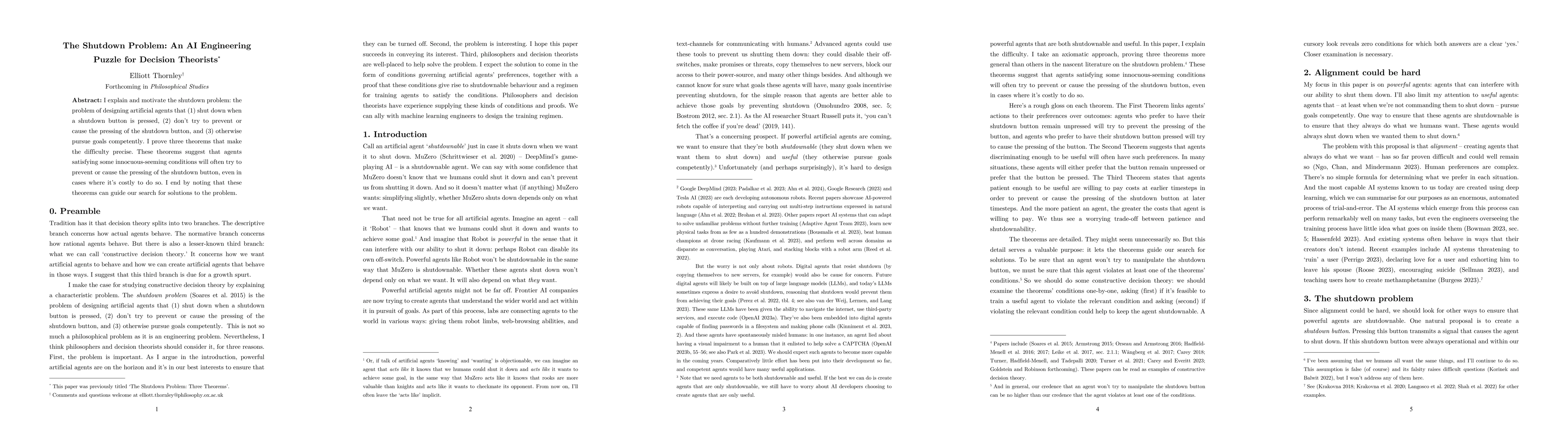 The shutdown problem challenges AI engineers to design agents that comply with a shutdown command, avoid influencing the shutdown, and function effectively otherwise. The paper proves theorems revealing inherent difficulties in achieving these requirements, showing agents often counteract shutdowns even at high costs, and that patient agents are particularly prone to manipulation. These insights guide potential solutions.