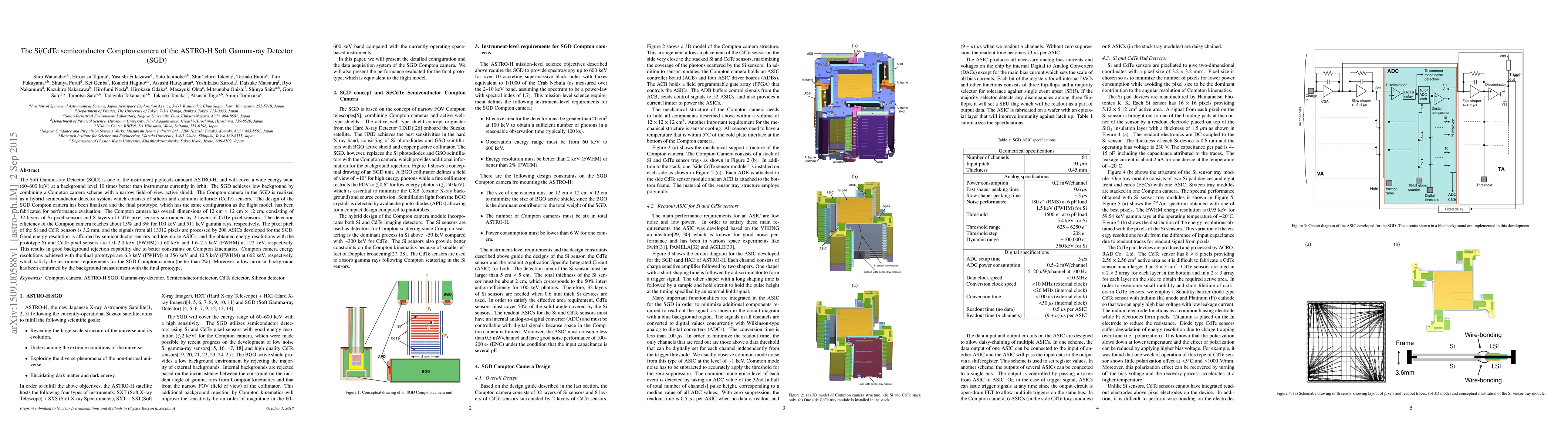 The ASTRO-H Soft Gamma-ray Detector (SGD) employs a Si/CdTe semiconductor Compton camera to achieve high-energy gamma-ray detection (60-600 keV) with superior background rejection. The prototype features a hybrid design with 32 layers of Si and 8 layers of CdTe sensors, achieving detection efficiencies of 15% and 3% for 100 keV and 511 keV gamma rays, respectively, and energy resolutions better than 2%.