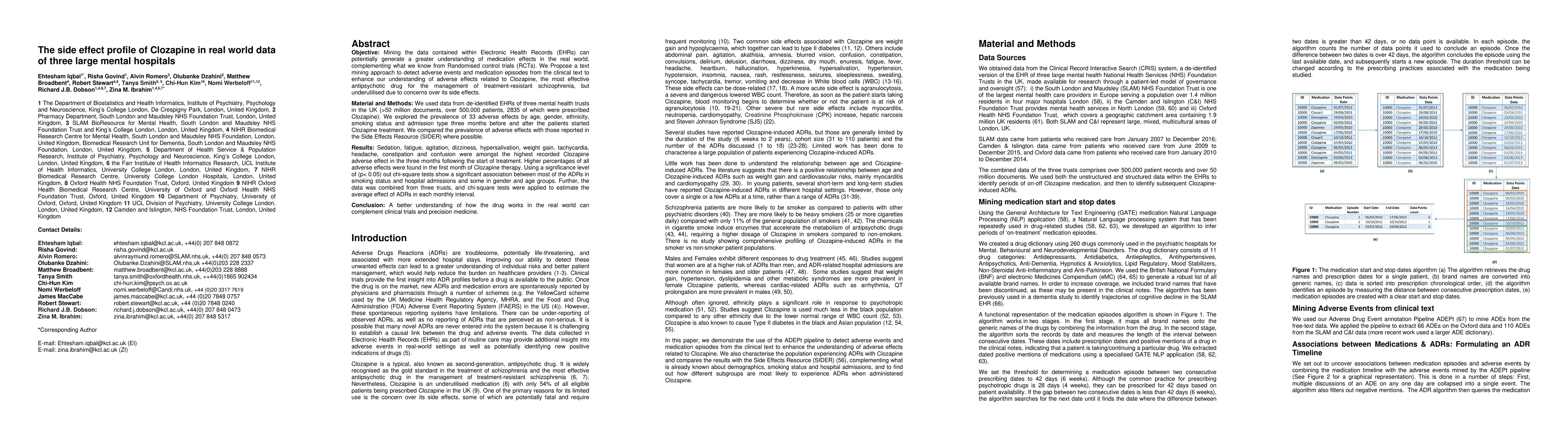 Objective: Mining the data contained within Electronic Health Records (EHRs) can potentially generate a greater understanding of medication effects in the real world, complementing what we know from Randomised control trials (RCTs). We Propose a text mining approach to detect adverse events and medication episodes from the clinical text to enhance our understanding of adverse effects related to Clozapine, the most effective antipsychotic drug for the management of treatment-resistant schizophrenia, but underutilised due to concerns over its side effects. Material and Methods: We used data from de-identified EHRs of three mental health trusts in the UK (>50 million documents, over 500,000 patients, 2835 of which were prescribed Clozapine). We explored the prevalence of 33 adverse effects by age, gender, ethnicity, smoking status and admission type three months before and after the patients started Clozapine treatment. We compared the prevalence of adverse effects with those reported in the Side Effects Resource (SIDER) where possible. Results: Sedation, fatigue, agitation, dizziness, hypersalivation, weight gain, tachycardia, headache, constipation and confusion were amongst the highest recorded Clozapine adverse effect in the three months following the start of treatment. Higher percentages of all adverse effects were found in the first month of Clozapine therapy. Using a significance level of (p< 0.05) out chi-square tests show a significant association between most of the ADRs in smoking status and hospital admissions and some in gender and age groups. Further, the data was combined from three trusts, and chi-square tests were applied to estimate the average effect of ADRs in each monthly interval. Conclusion: A better understanding of how the drug works in the real world can complement clinical trials and precision medicine.